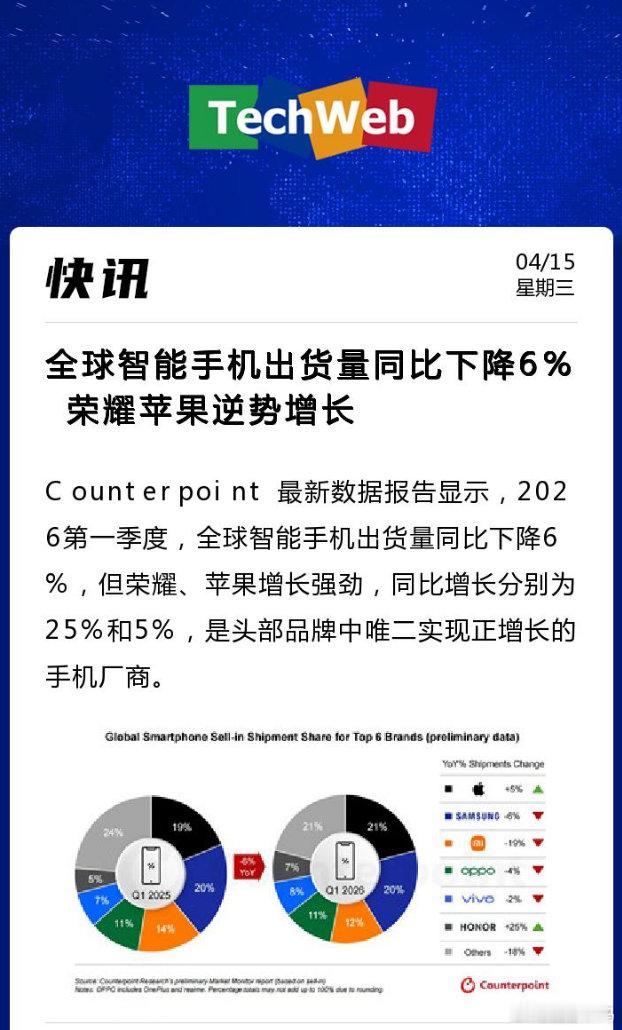 2026年一季度全球智能手机出货量同比下滑6%,但是荣耀、苹果两家却是逆势增长。荣耀不光是安卓阵营唯一正增长厂商并且比值高达 25%,荣耀就是凭借着深厚的底蕴和产品力争得了用户的认可。国产手机出货逆势增长25%