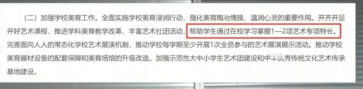 全国要普及艺术教育了!培训机构的春天还是灾难?教育部刚出的文件,要完善学校艺术展演机制,每个学生在校必须掌握1-2项艺术专项特长。每学期至少开展一次全员参与的艺术展演活动。