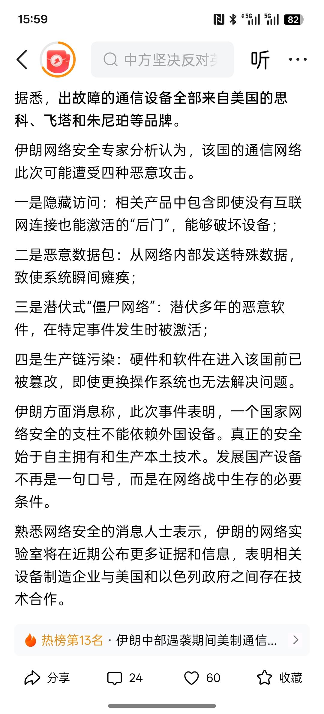 这直接利好中国的通讯设备与操作系统!原来以前是美国贼喊捉贼!伊媒最新披露:伊朗中部遭袭时,思科、飞塔和朱尼珀等大量美制通信设备突然失灵,操作系统崩溃!伊朗方面的诉说,美国对伊朗中部地区发起了战争,直接导致大量的美制通讯设备失灵,包括操作系统和崩溃,那背后所折射的是什么问题?当然是这些操作系统由美国或者以色列进行,拥有部门的技术让它失灵!后续伊朗方面会公布更多的数据与证据!可想而知,在战争时期,你所用的是这样美字的通讯设备,操作系统,你跟美国发生战争一旦通过后门,可以把你这些全部关停或者失灵,你怎么打这场战争?只能是站在那里挨打的份!