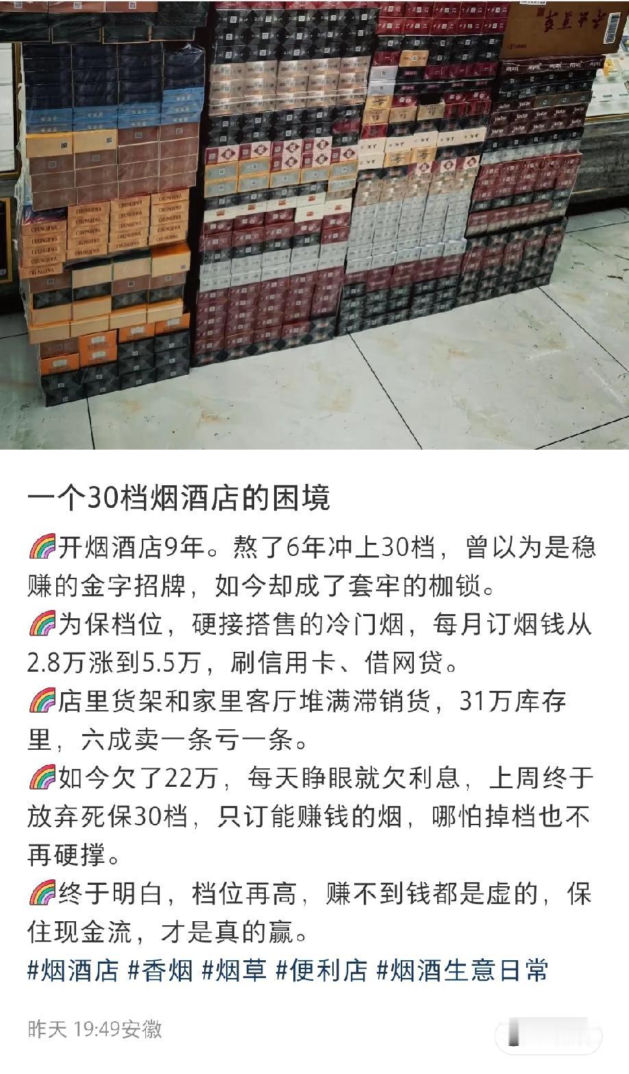 安徽网友发文吐槽:开烟酒店开了9年,苦哈哈的把香烟的销售档位熬到了30档,本以为应该稳赚了,不想却把我深度套牢了……