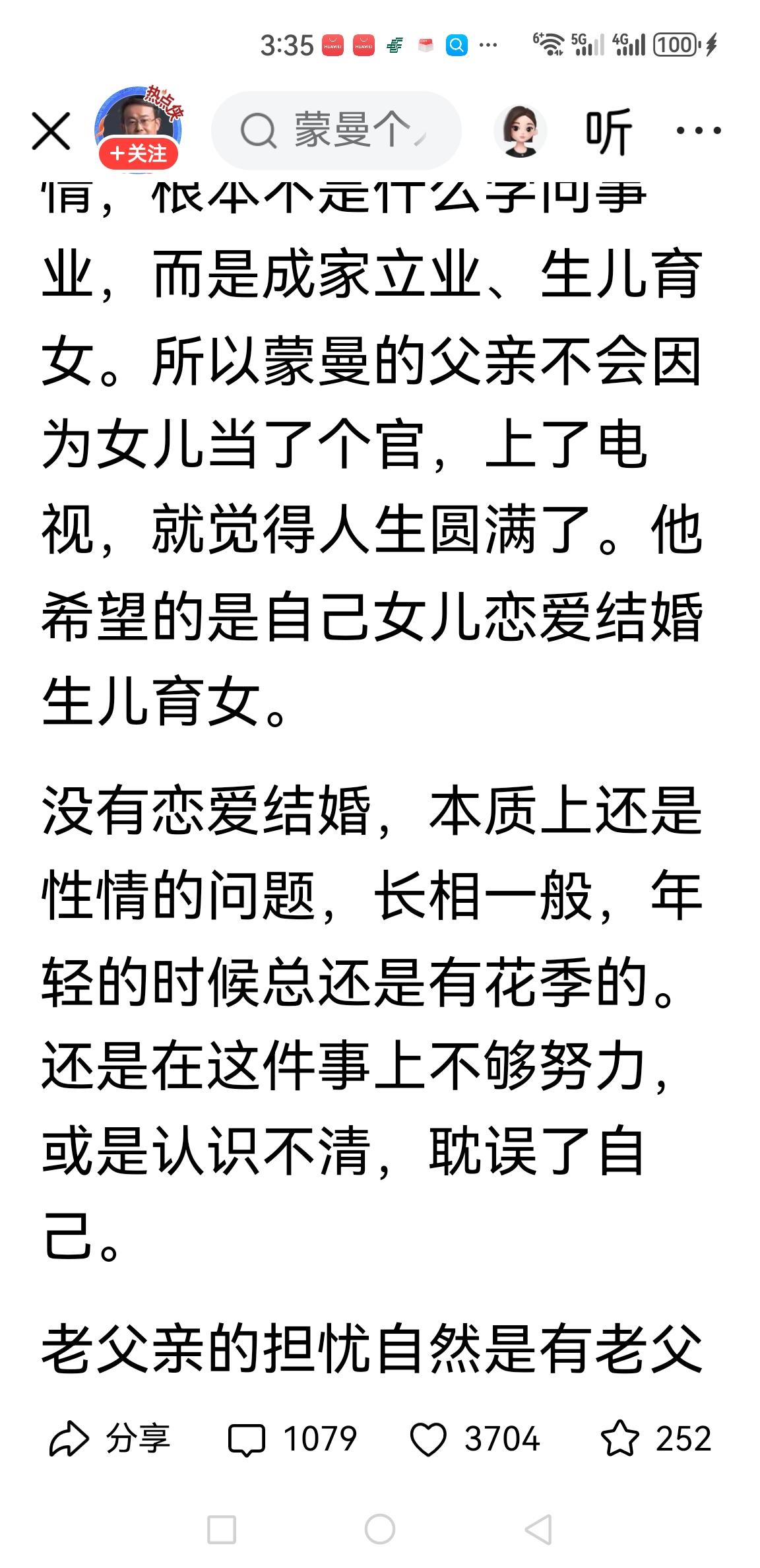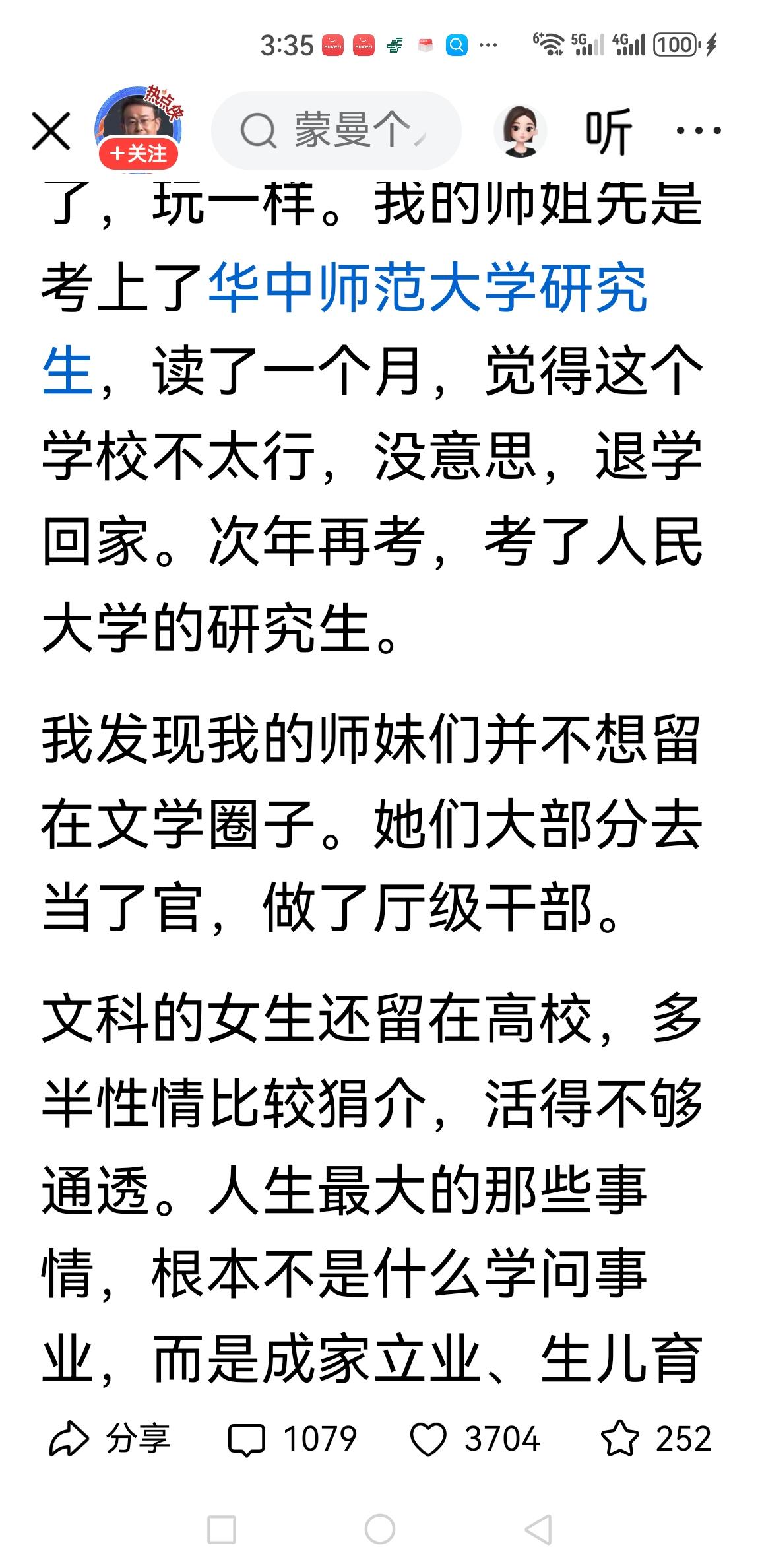 我有一晚辈朋友,女儿正念大学,谈及事业与婚姻之纠结,甚是苦恼。如今就业压力大,想读硕之后再冲博士,又担心错过婚缘。问我,我谈个人观点,读大学或研究生时,有合适的,就先成婚,博士之事先搁置……