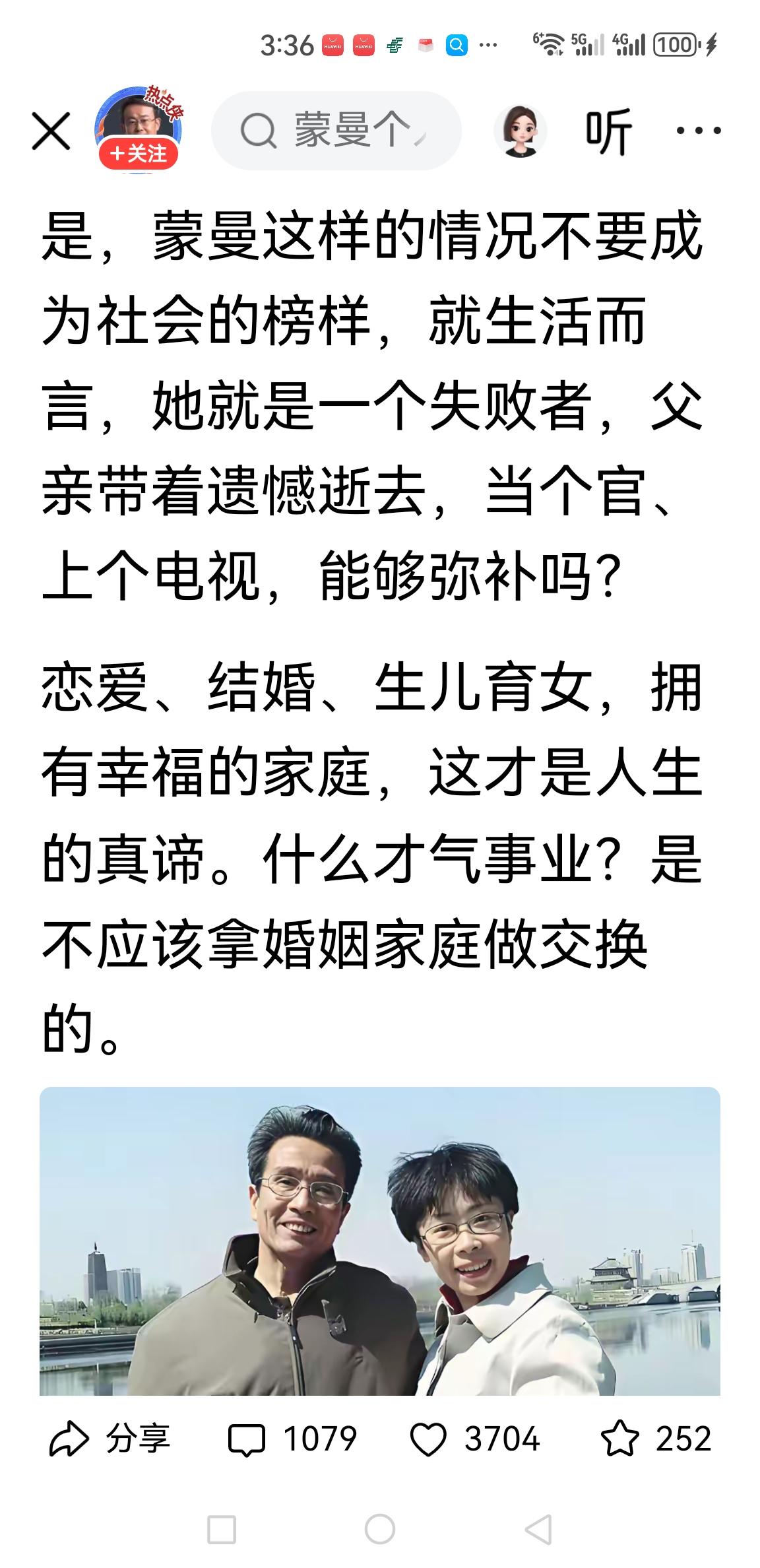 从世俗伦理与家庭责任来看,结婚生子本是多数人生命中重要的一环。父母含辛茹苦养育子女,大多期盼看到子女成家立业、血脉延续。蒙曼学识渊博、事业有成,固然令人敬佩,但父亲带着未能看到她组建家庭的遗憾离世,终究是人生一大缺憾。这份遗憾,并非官位与名气所能轻易抹平,也不是学术成就可以替代。
