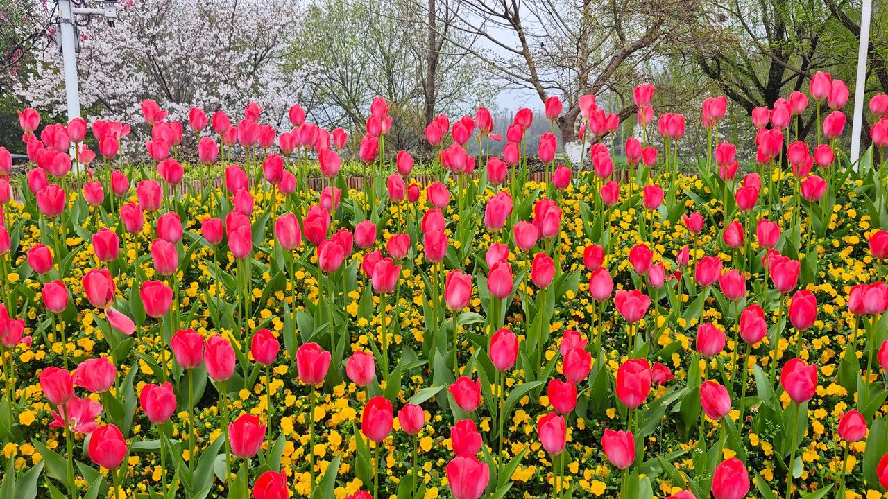 春天一到,这片花海就醒了。郁金香、二月兰、虞美人层层叠叠铺开来,粉的、紫的、黄的,顺着缓坡漫到山脚,风一吹,花浪晃得人眼晕。说真的,比城里公园挤挤挨挨的花展舒服多了,人不多,能安安稳稳站在花田边,闻着花香发会儿呆。