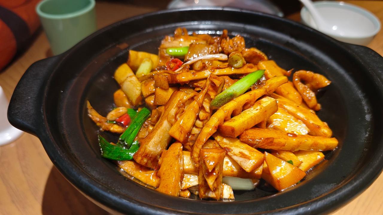 别以为人文餐厅只重环境,味道一点不含糊。主打江浙菜,还融了“江南印记”的传统手艺,食材都是本地鲜货,吃的就是安吉的本味。泥炉鸡煲必点,竹林散养的土鸡文火慢炖,汤头澄黄,肉嫩皮滑,喝一口暖到胃里,鲜得眉毛都要掉了。还有本地鲜笋做的各式菜,春天的笋最是清甜,不管是清炒还是炖汤,一口咬下去都是山林的脆嫩,这是只有在安吉才能吃到的时令鲜气。
