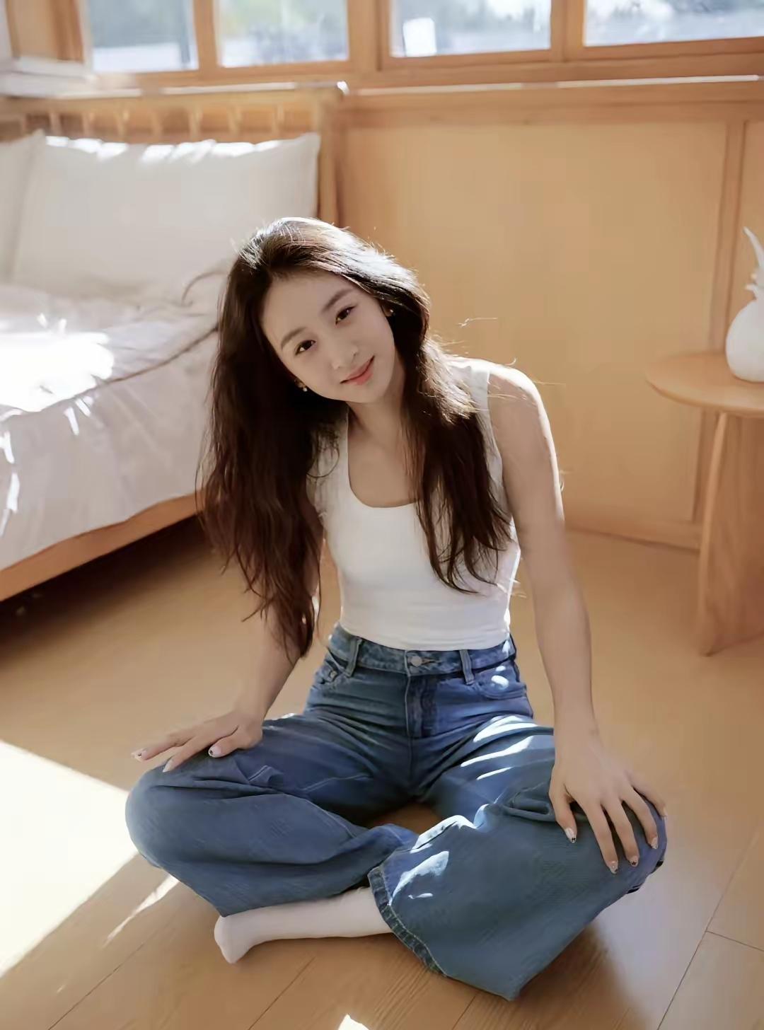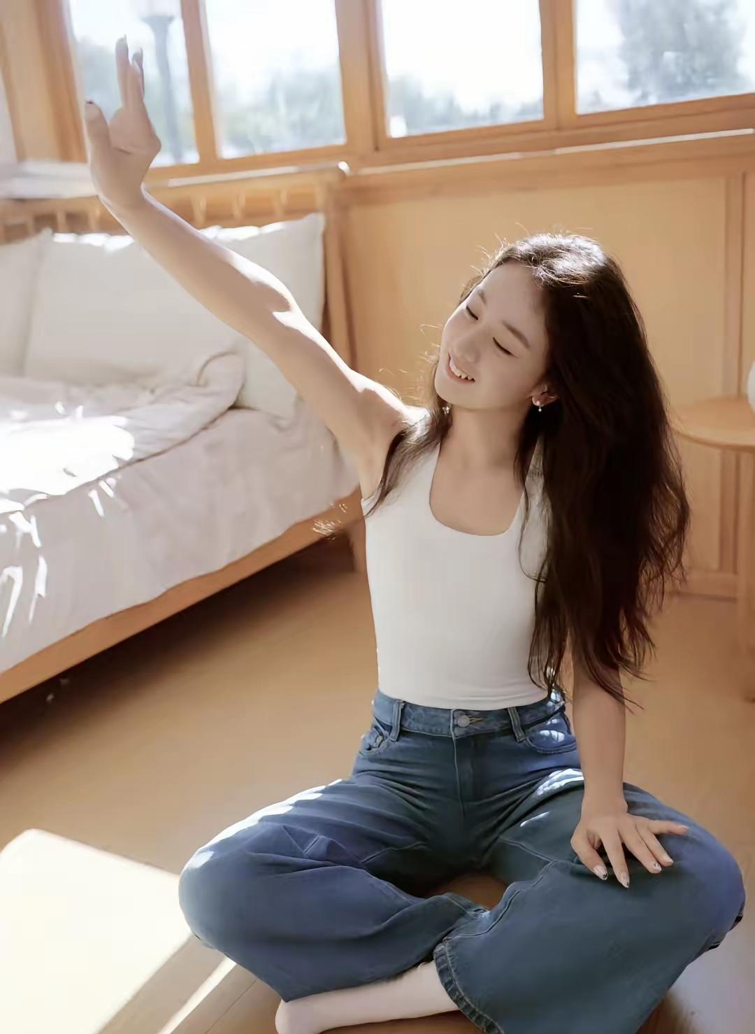3月15日,森蝶迎来18岁生日,照片中穿白色背心搭配蓝色牛仔,长发披肩,又美又温柔!