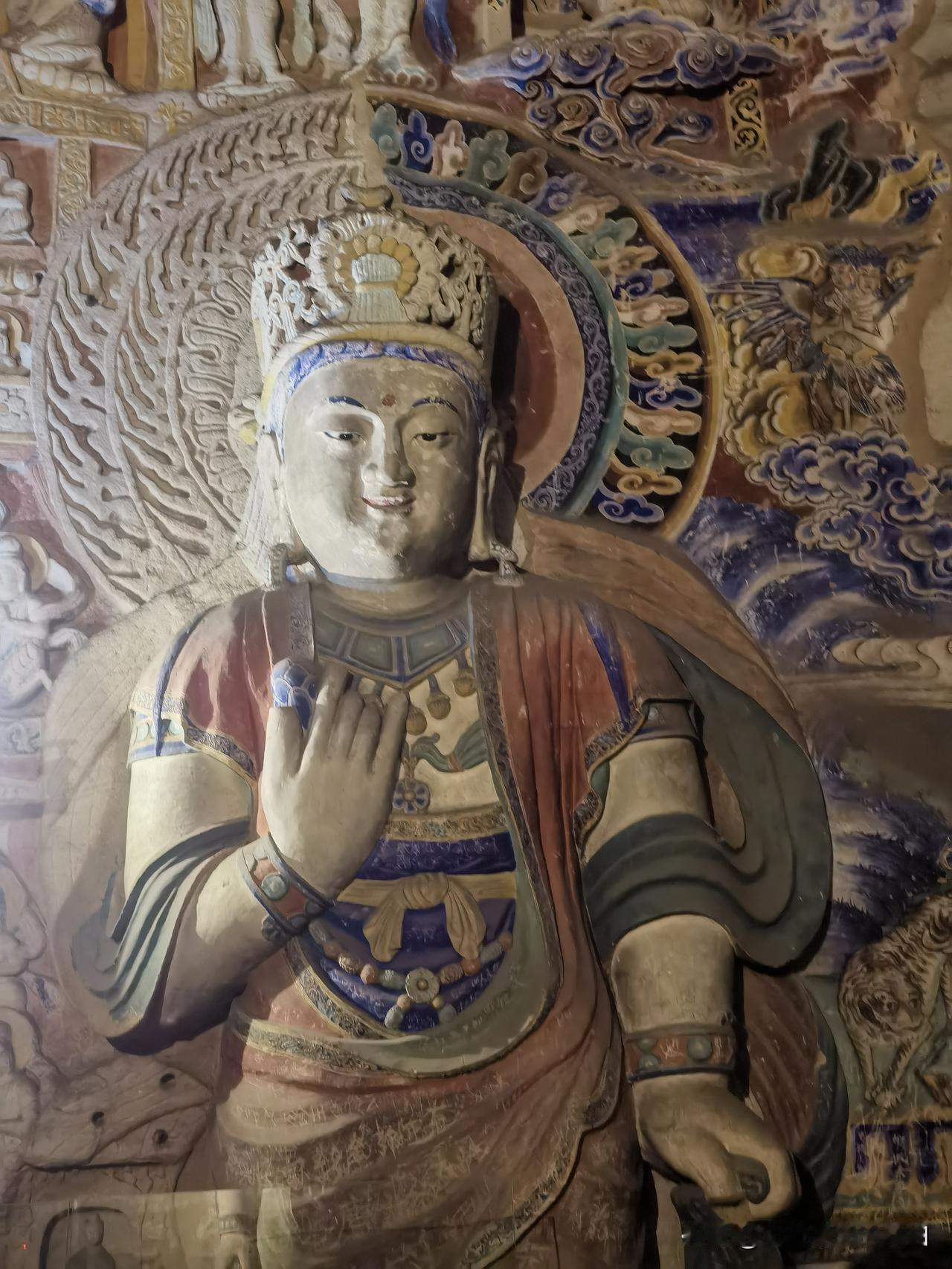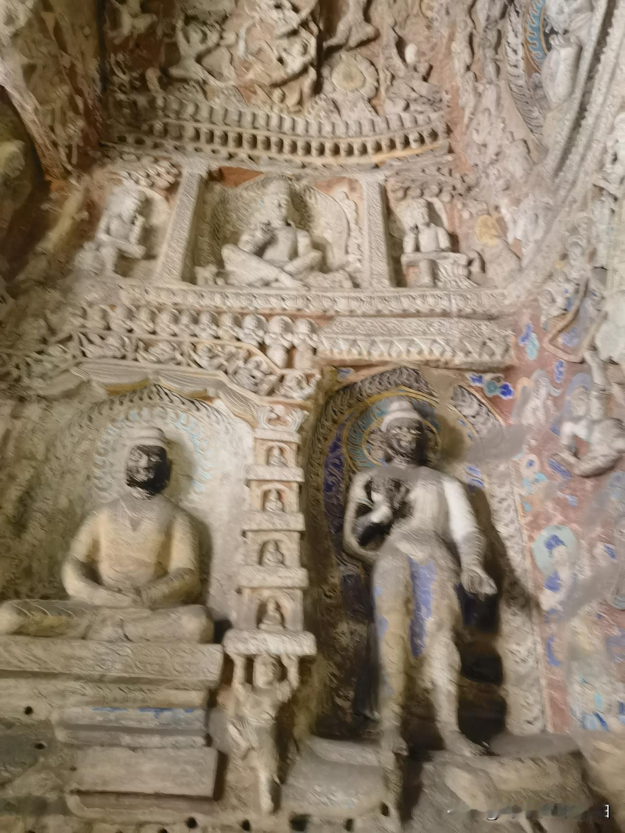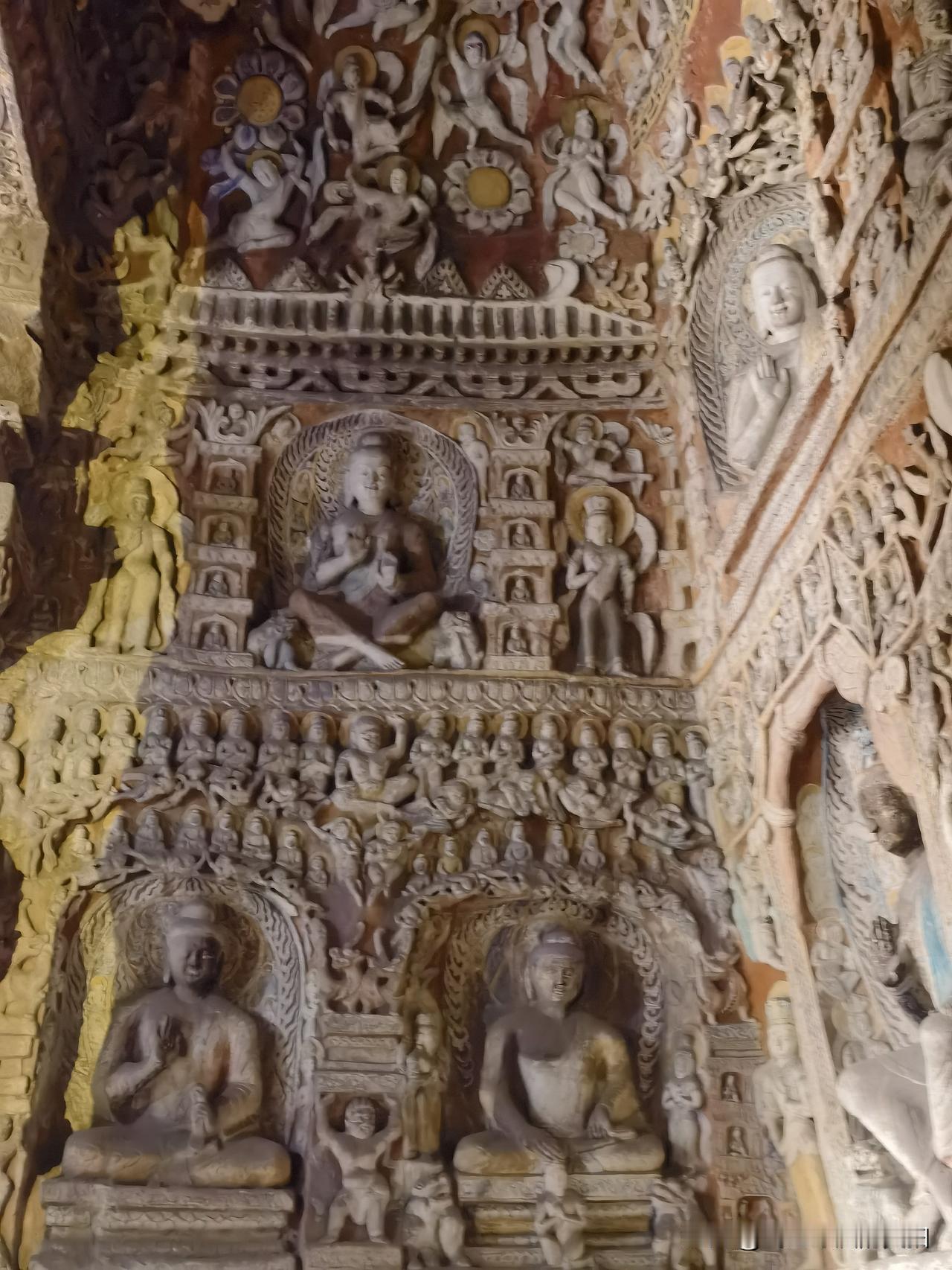今天给大家分享几张大同云冈石窟第九窟照片,第九窟是云冈石窟五华洞窟之一,色彩艳丽,是北魏石窟最精美洞窟。与第十窟是一组双窟,为前廊后室殿堂式风格。色彩为后期明清时期的彩绘。可与第十一至第十三一起游览,第十二窟也被称为“音乐窟”