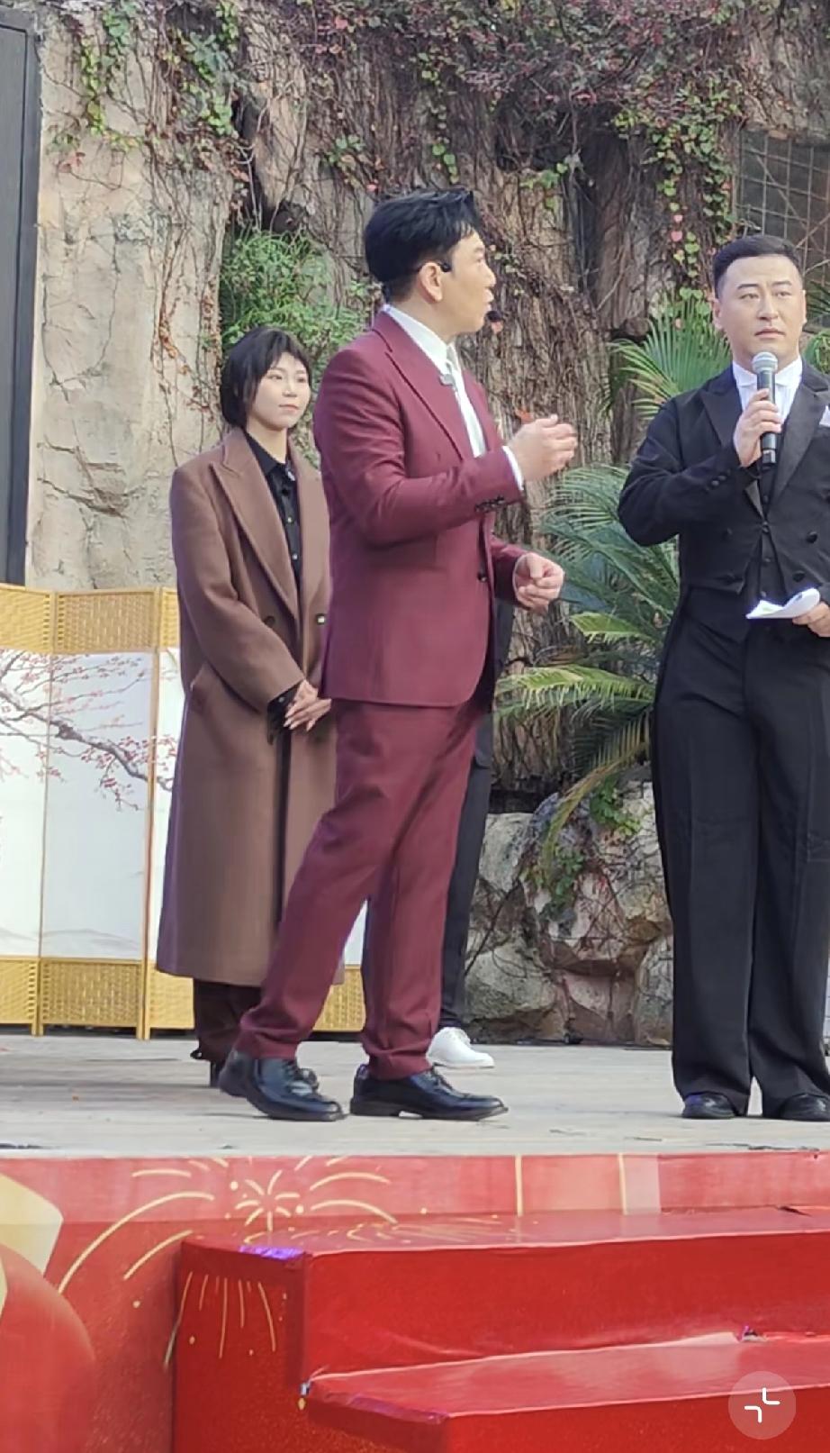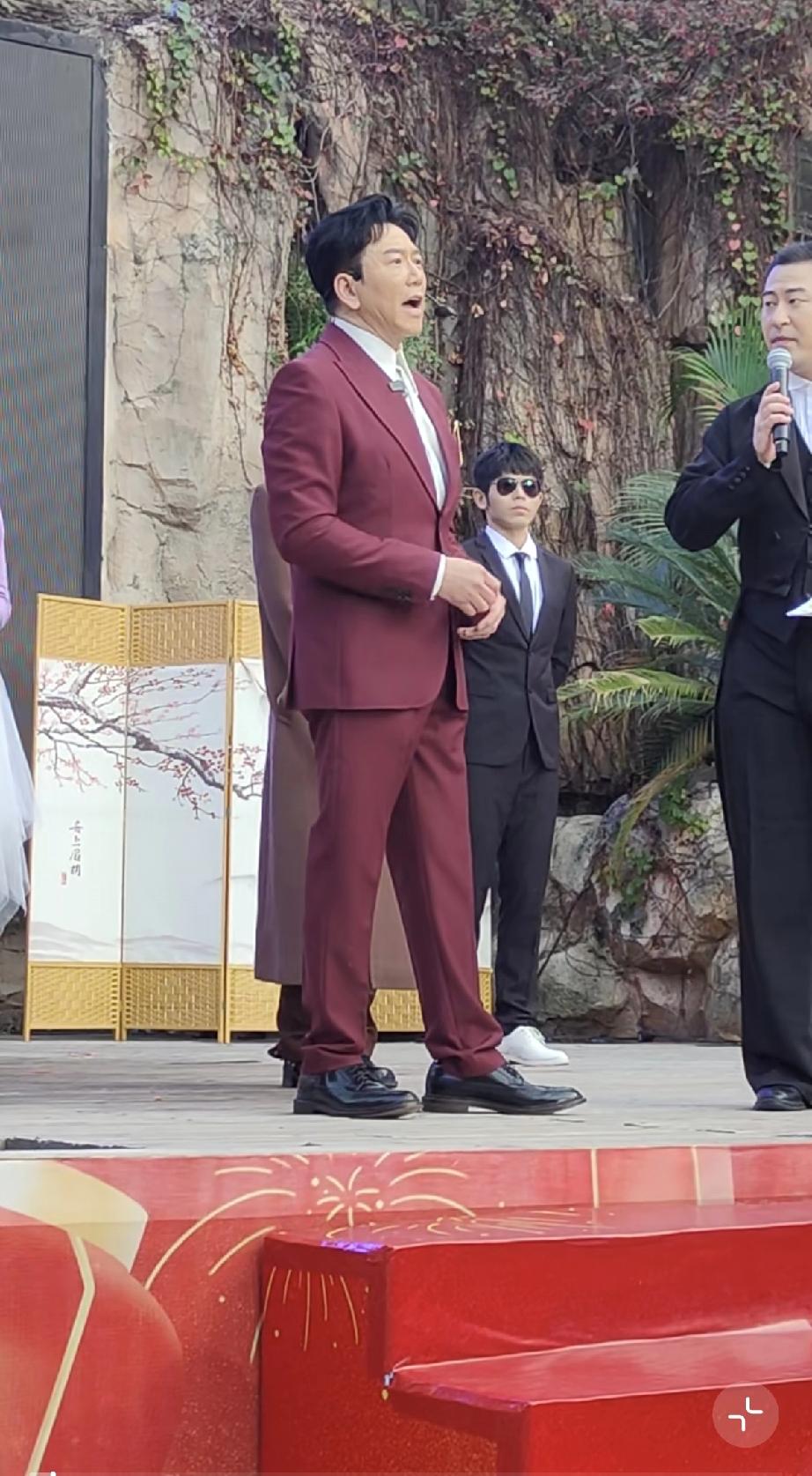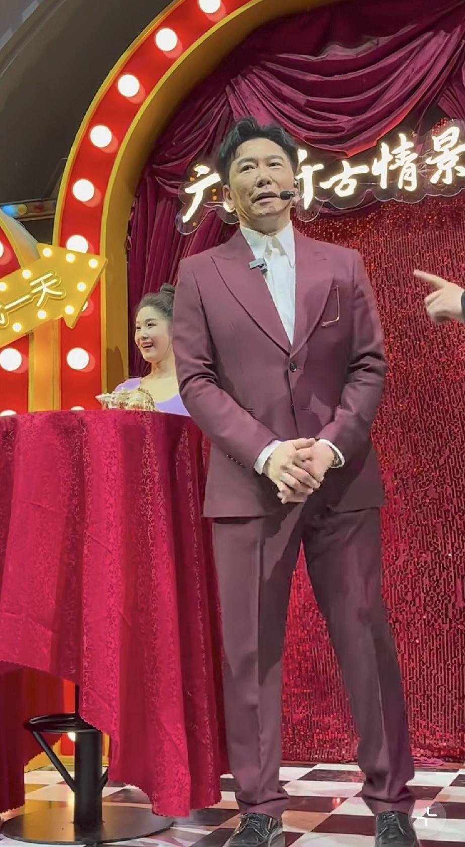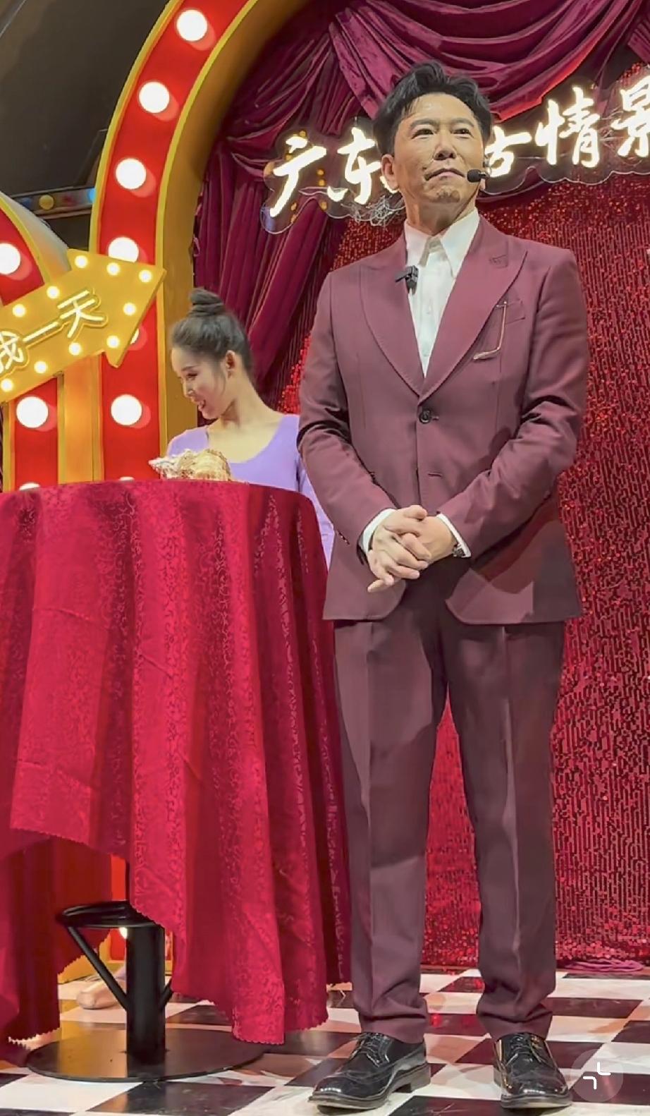 温兆伦是上世纪八九十年代中国香港的老牌明星,如今62岁了,穿了一身玫红色的西装显得皮肤比较白。