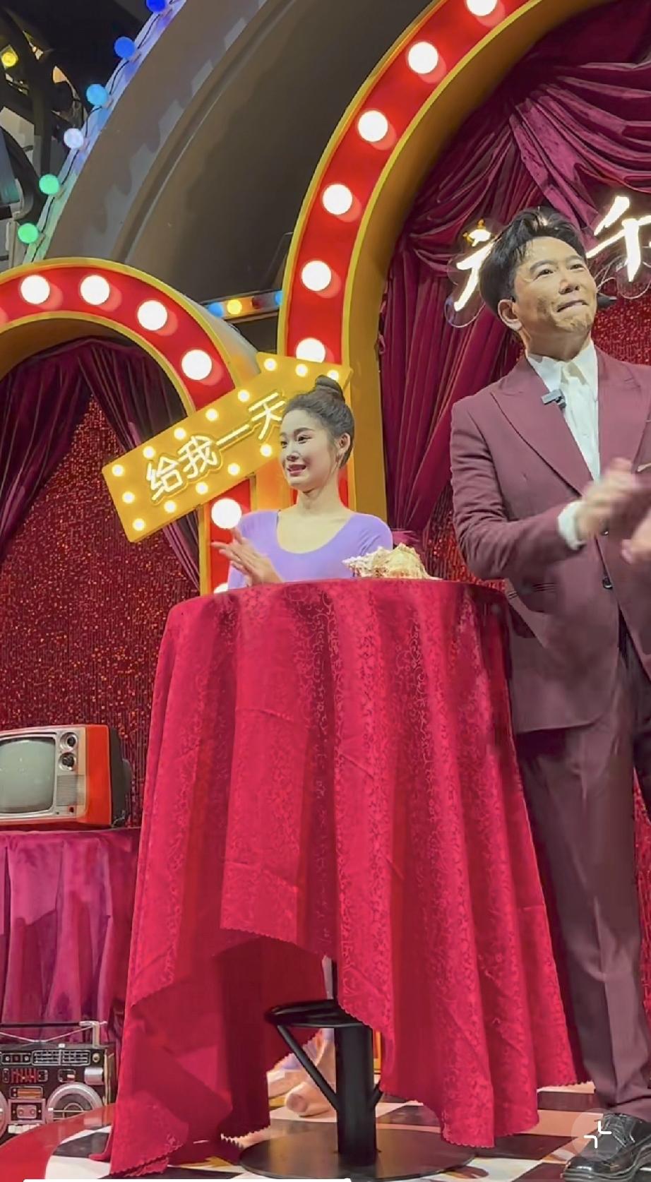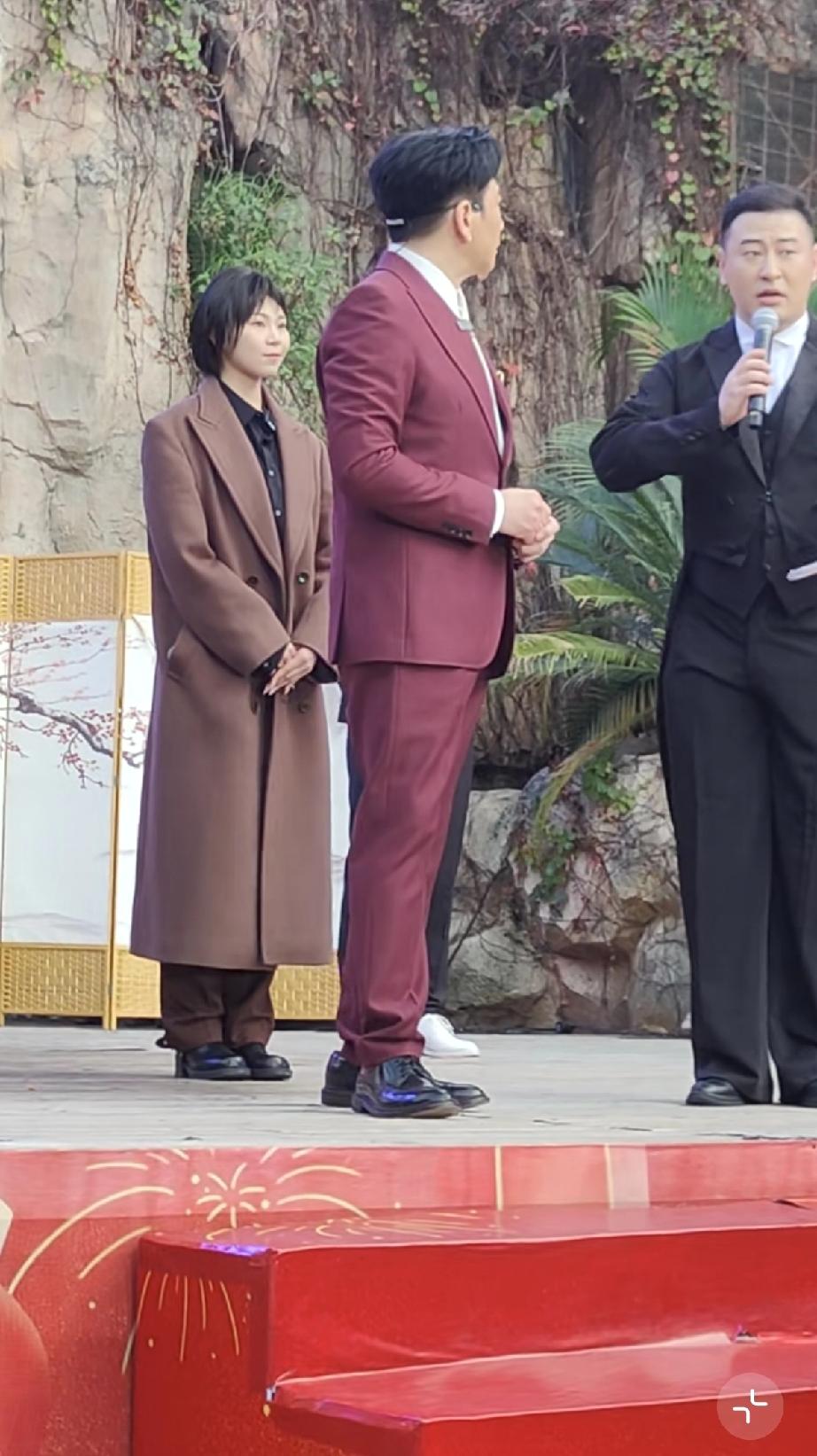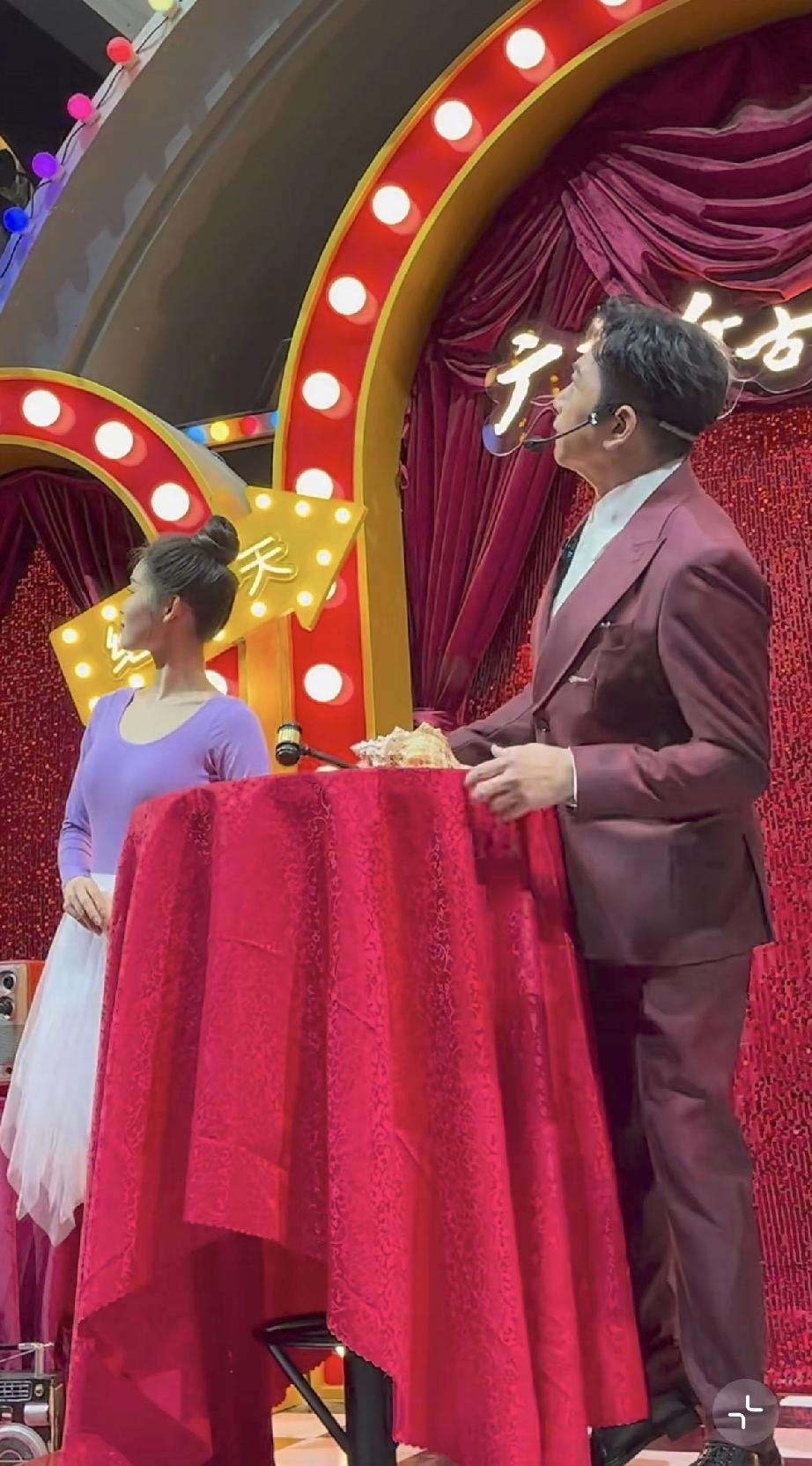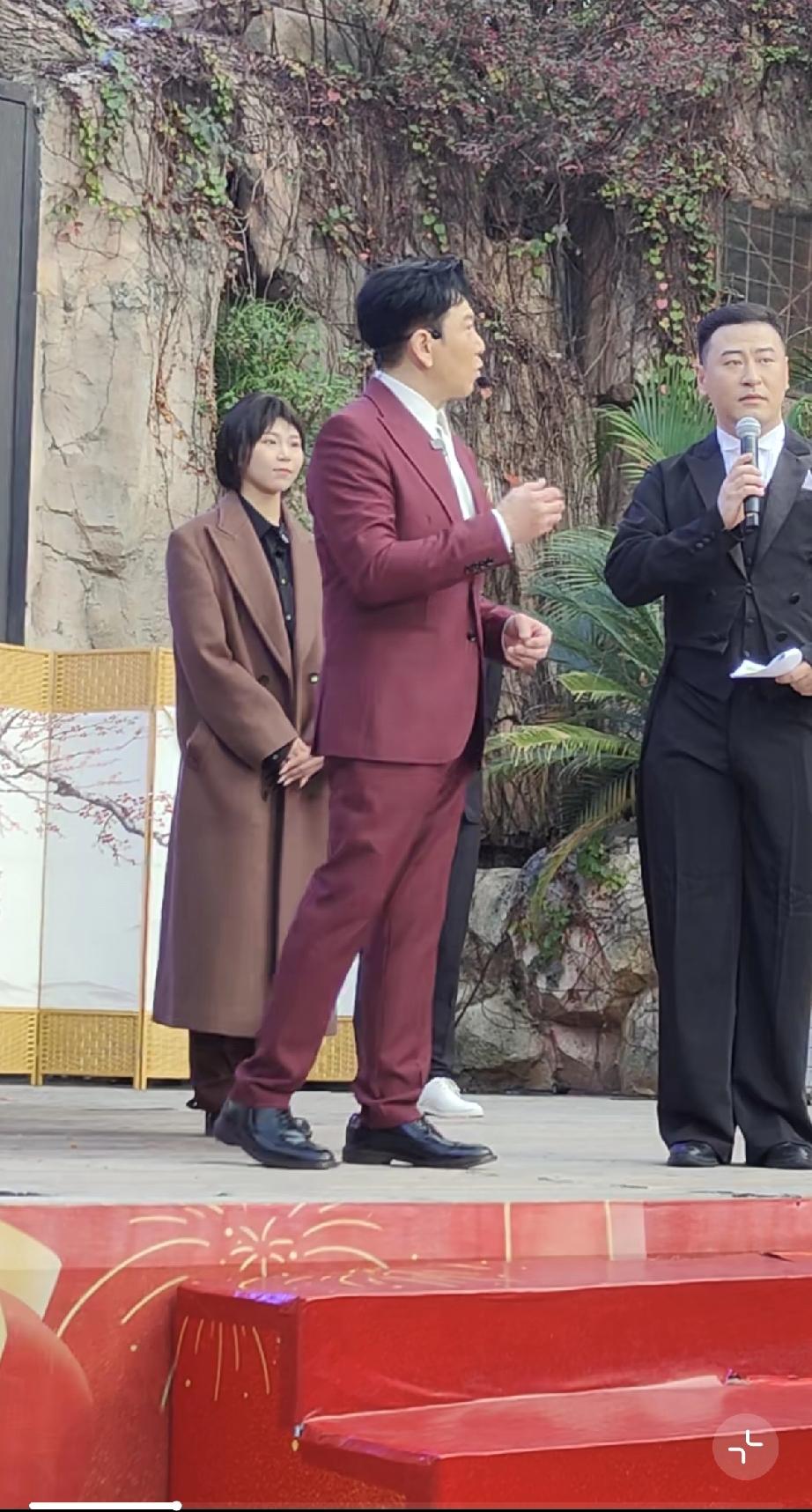 温兆伦是上世纪八九十年代中国香港的老牌明星,如今62岁了,穿了一身玫红色的西装显得皮肤比较白。