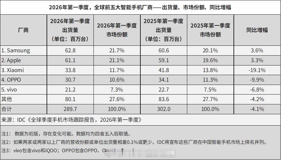 IDC 的 2026Q1 智能手机出货量报告出炉,和其它数据机构的趋势类似,国内市场的跌幅比全球市场更大一些,苹果在中国市场的出货暴增,而小米则有 TOP 厂商里最大的同比跌幅。