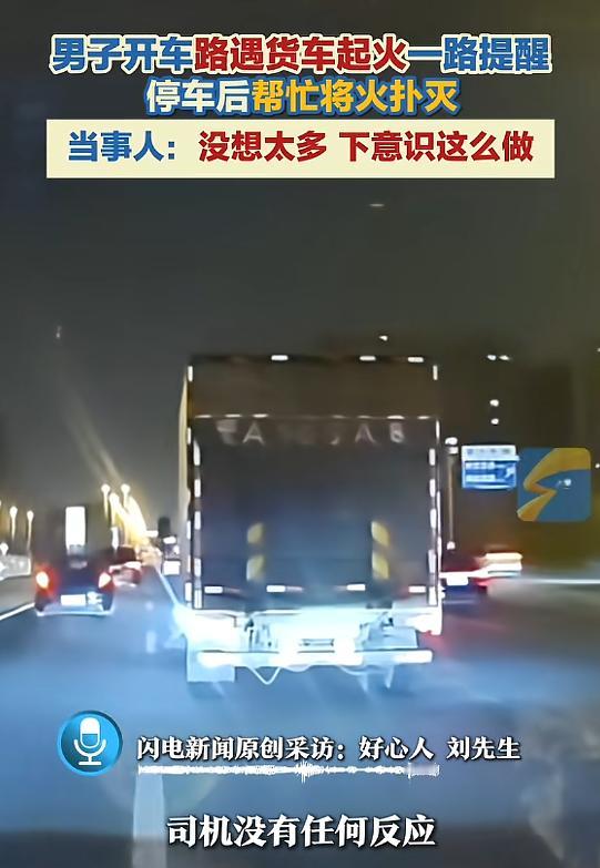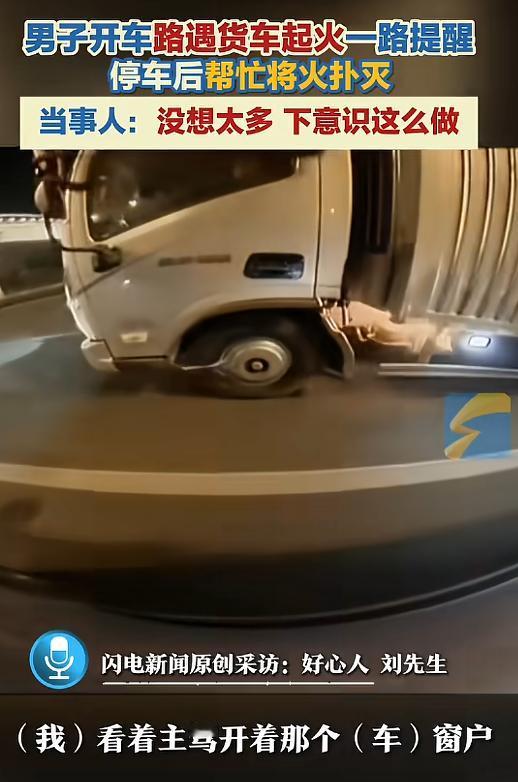 (信息来源:《4月13日,山西太原,男子开车路遇货车起火一路提醒,停车后帮忙将火扑灭。》闪电新闻)