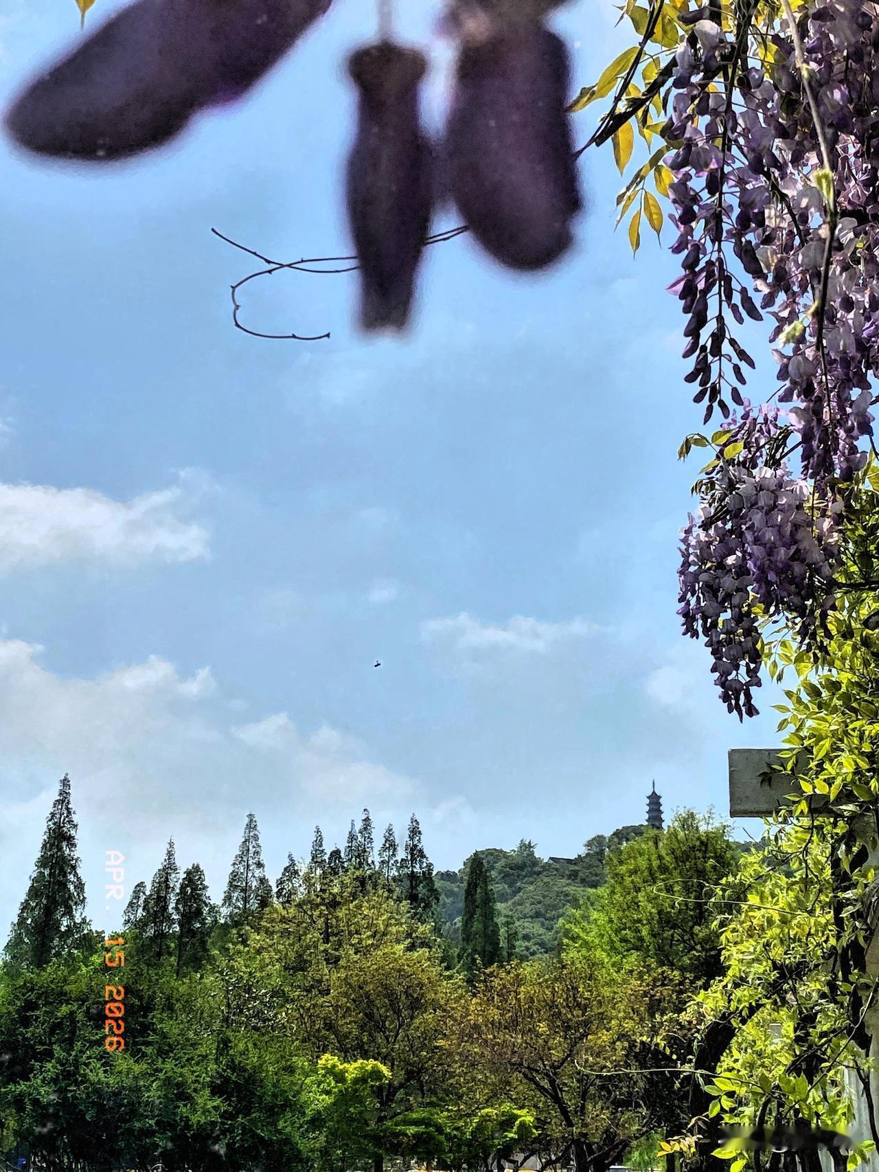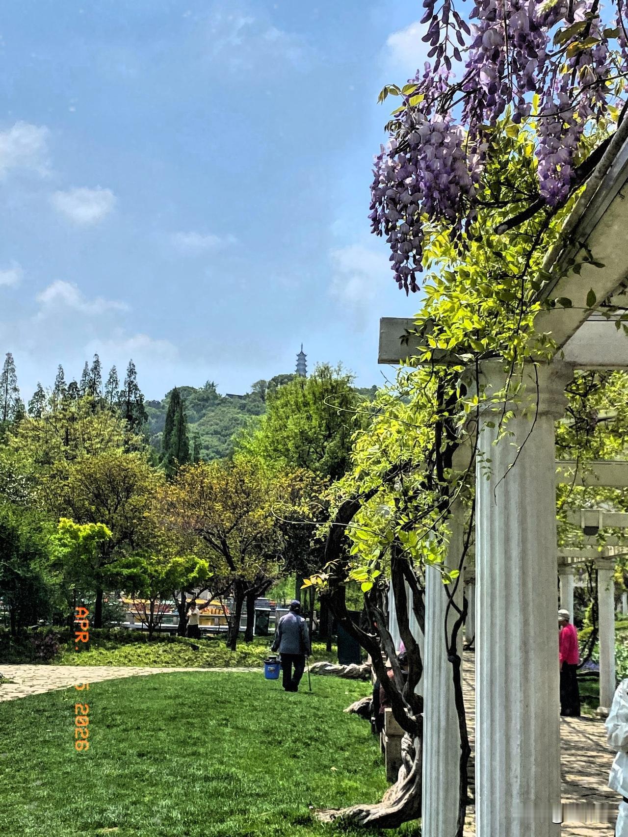 上方山紫藤花也已盛开了,山顶的千年楞伽塔又高又远。