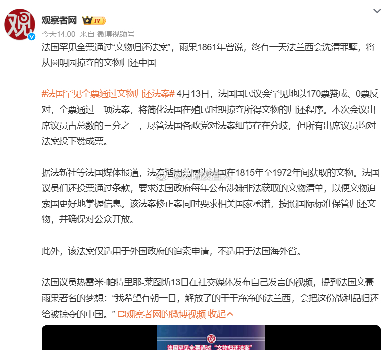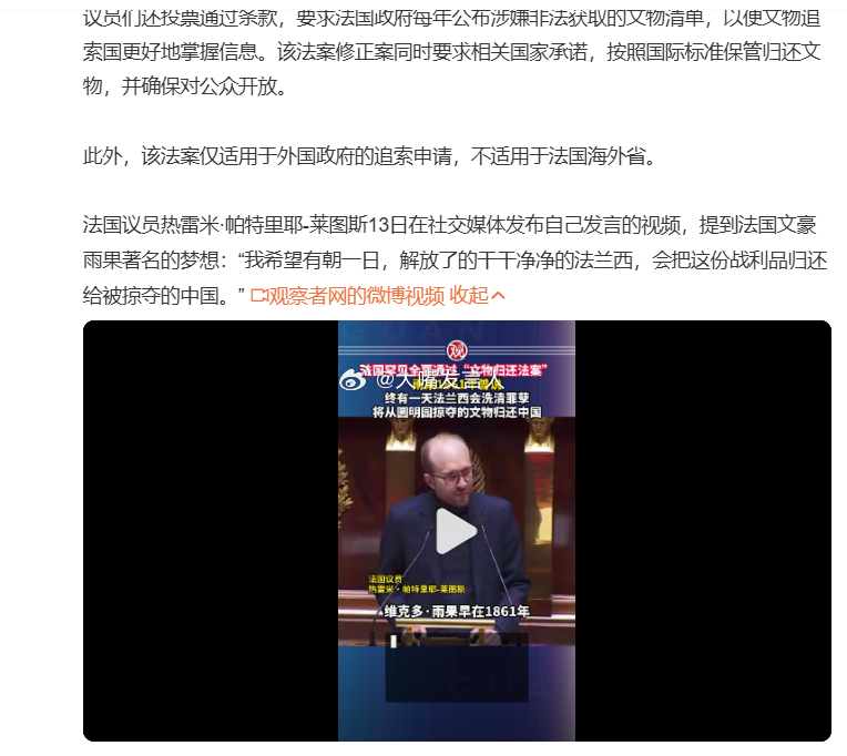 法国全票通过文物归还”赎罪案”。法国藏有260万件中国文物…[捂脸哭]4月13日