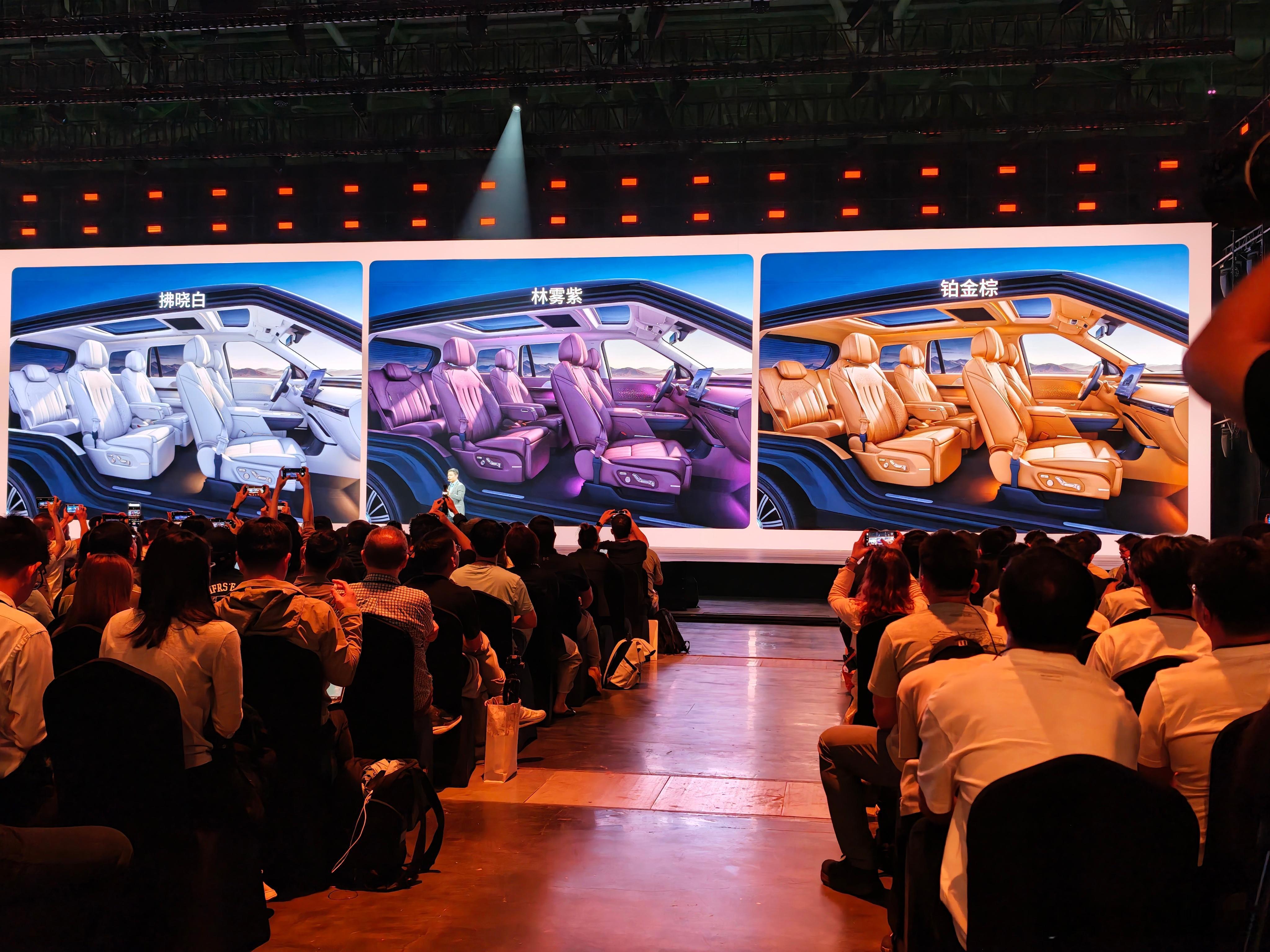 后轮转向(5.4m转弯半径)、四门电动门、22寸超宽鸳鸯胎+豪华悬浮轮毂、寰宇天地前后贯穿灯、百万像素AI数字投影大灯、三层氛围灯、3180W车内供电接口等等。