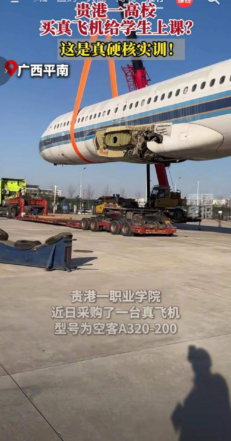 近日广西贵港一学校,“硬核实训”是真的!购入的是退役飞机,核心用于航空相关专业(如飞机维修、航空服务)的实操教学,让学生直观接触飞机结构、设备原理,比纯理论教学更具实用性。(来源于@南国早报 )
