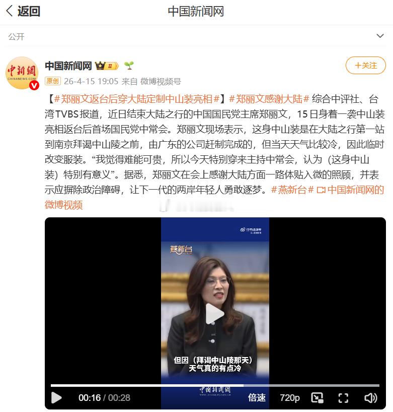 郑丽文返台后穿大陆定制中山装亮相 转中新网:郑丽文,15日身着一袭中山装亮相返台后首场会议