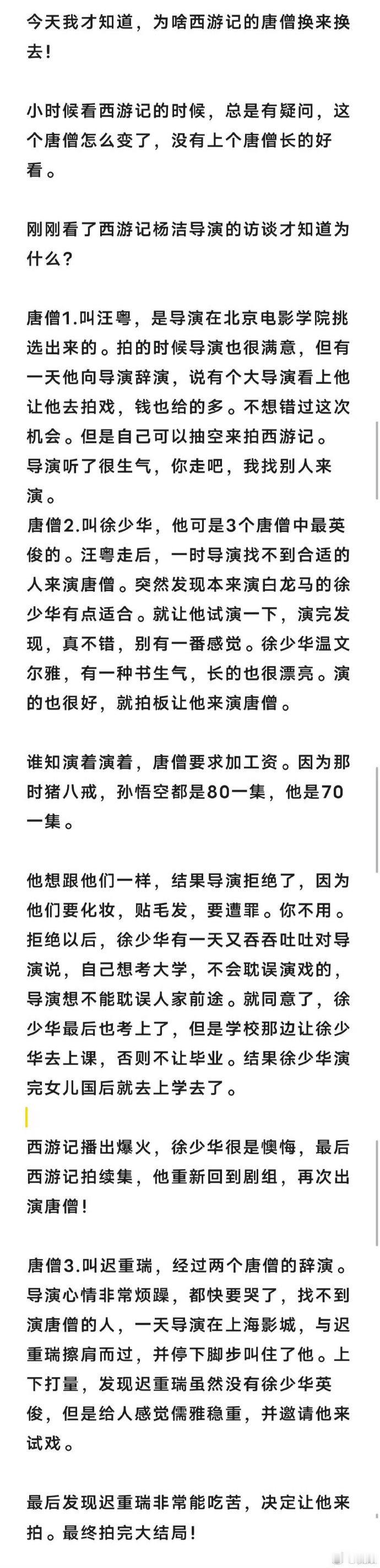 网友:今天我才知道,为啥西游记的唐僧换来换去了