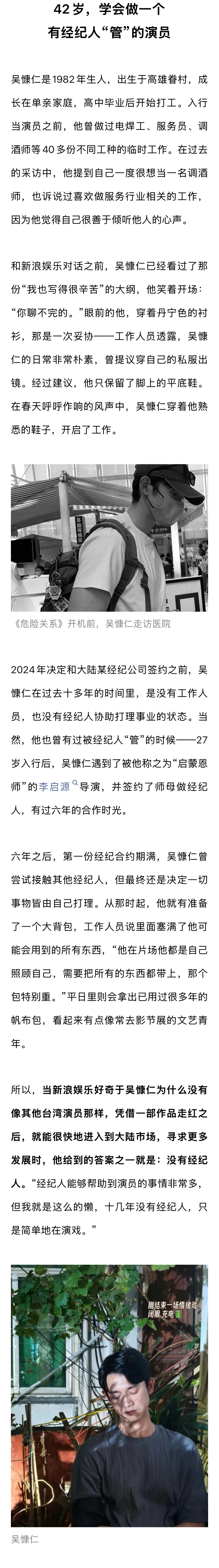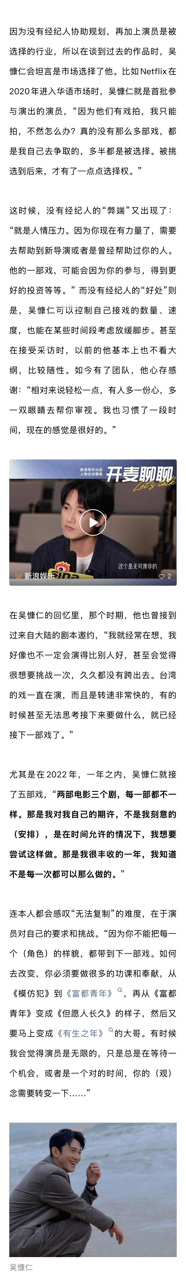 吴慷仁不想浪费别人对他的好奇心吴慷仁说大陆优秀的演员太多了 当新浪娱乐好奇于吴慷仁为什么没有像其他台湾演员那样,凭借一部作品走红之后,就能很快地进入到大陆市场,寻求更多发展时,他给到的答案之一就是:没有经纪人。“经纪人能够帮助到演员的事情非常多,但我就是这么的懒,十几年没有经纪人,只是简单地在演戏。”