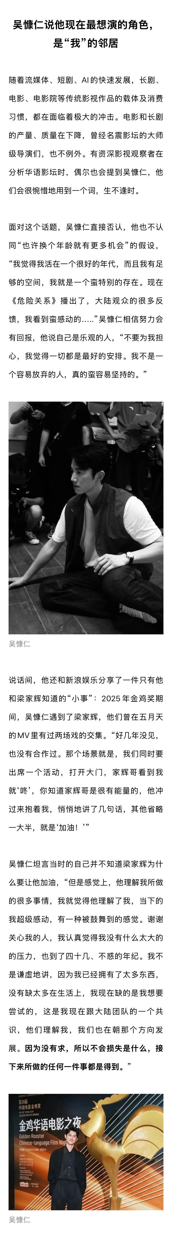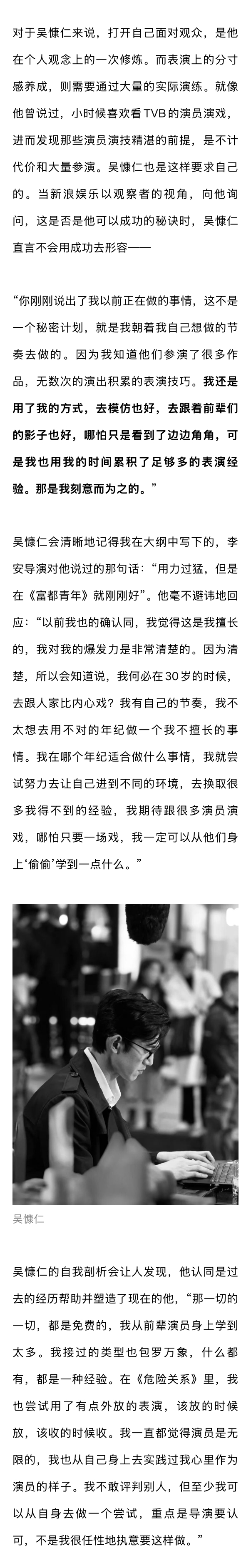 吴慷仁的自我剖析会让人发现,他认同是过去的经历帮助并塑造了现在的他,“那一切的一切,都是免费的,我从前辈演员身上学到太多。我接过的类型也包罗万象,什么都有,都是一种经验。在《危险关系》里,我也尝试用了有点外放的表演,该放的时候放,该收的时候收。我一直都觉得演员是无限的,我也从自己身上去实践过我心里作为演员的样子。我不敢评判别人,但至少我可以从自身去做一个尝试,重点是导演要认可,不是我很任性地执意要这样做。”
