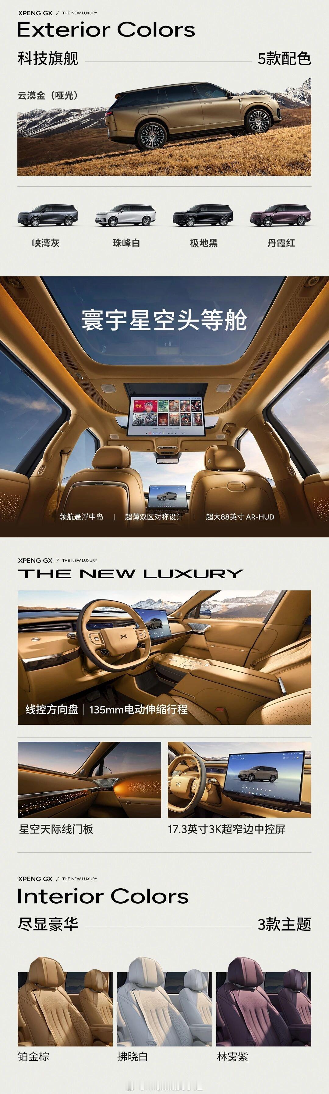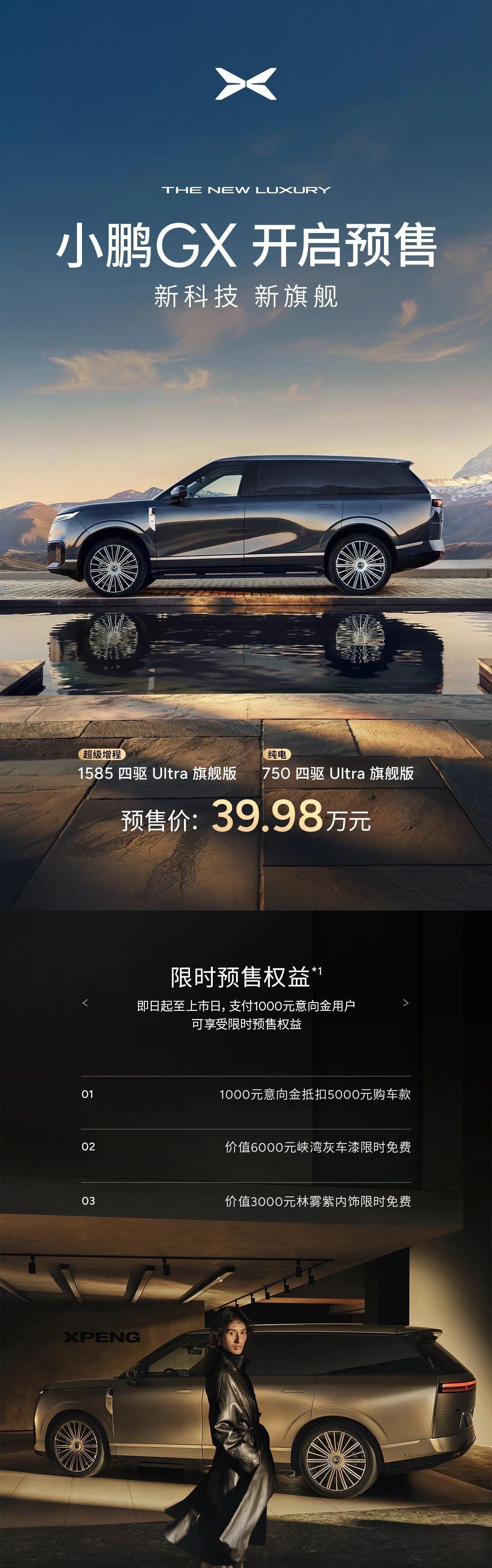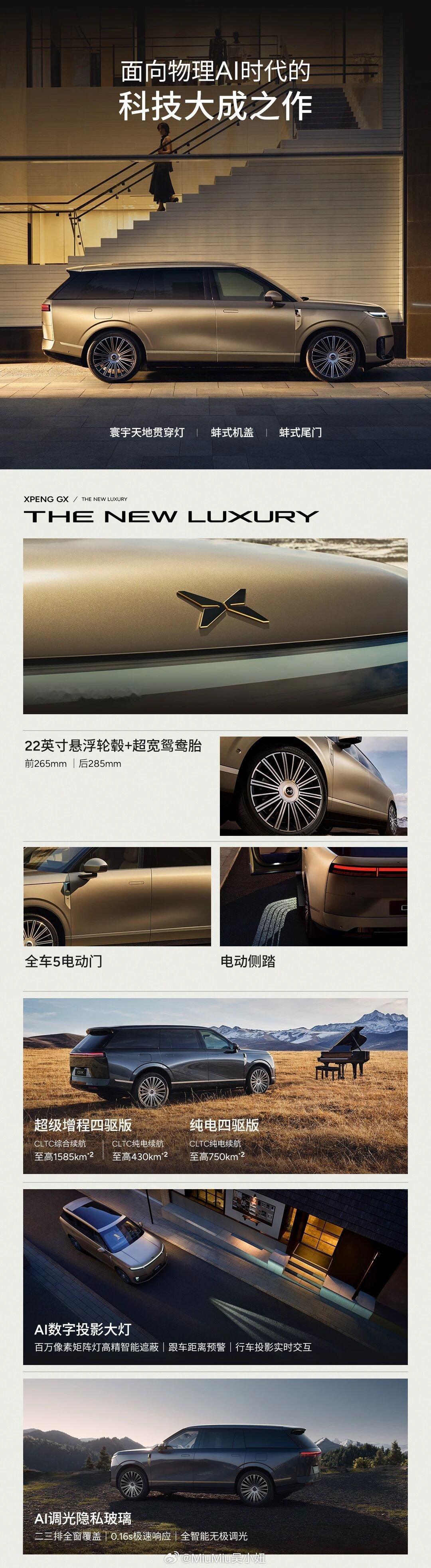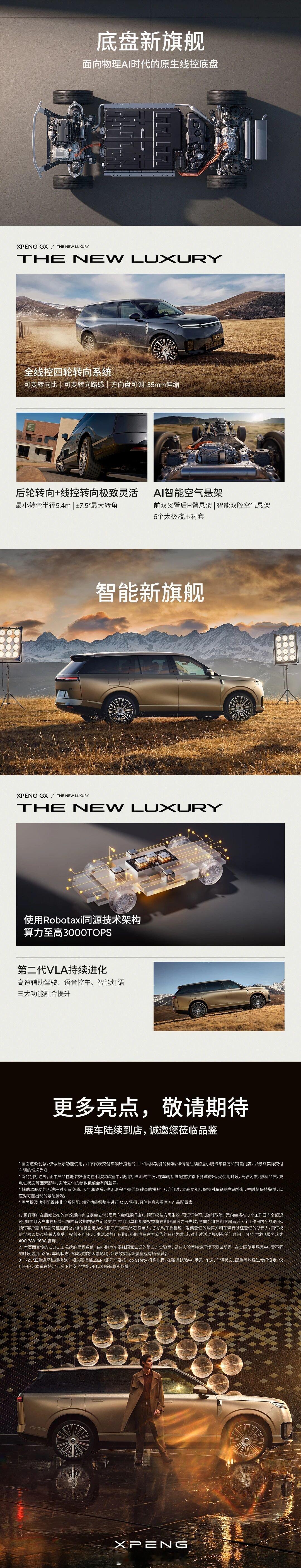 小鹏GX小鹏首款全尺寸旗舰SUV~GX今日正式开启预售~预售价39.98万元!核心四大亮点:安全、操控、智驾、家庭☞安全新旗舰:“城堡式安全”车身结构,全球最大16000T前后一体大压铸技术,成功挑战720°五重连环碰撞测试。☞操控新旗舰:面向物理 AI 时代的原生线控底盘,集成 X-VMC 智能融合系统、线控液压制动、线控转向、AI 智能悬架、智能四驱、线控后轮转向,全维度重构大车操控体验。☞智驾新旗舰:中国首款全栈自研的Robotaxi量产车型,第二代VLA智驾系统持续进化,智驾、语音、灯语深度融合。支持园区漫游能力,可应对雨雾、暗光场景。支持本地大模型,实现模拟语义对话。☞家庭新旗舰:全球唯一三排电动三折叠,同级最大的后备箱空间、最快响应的AI隐私玻璃、AI无菌风冷双开门冰箱、2把零重力和1把飞航舒享座椅。