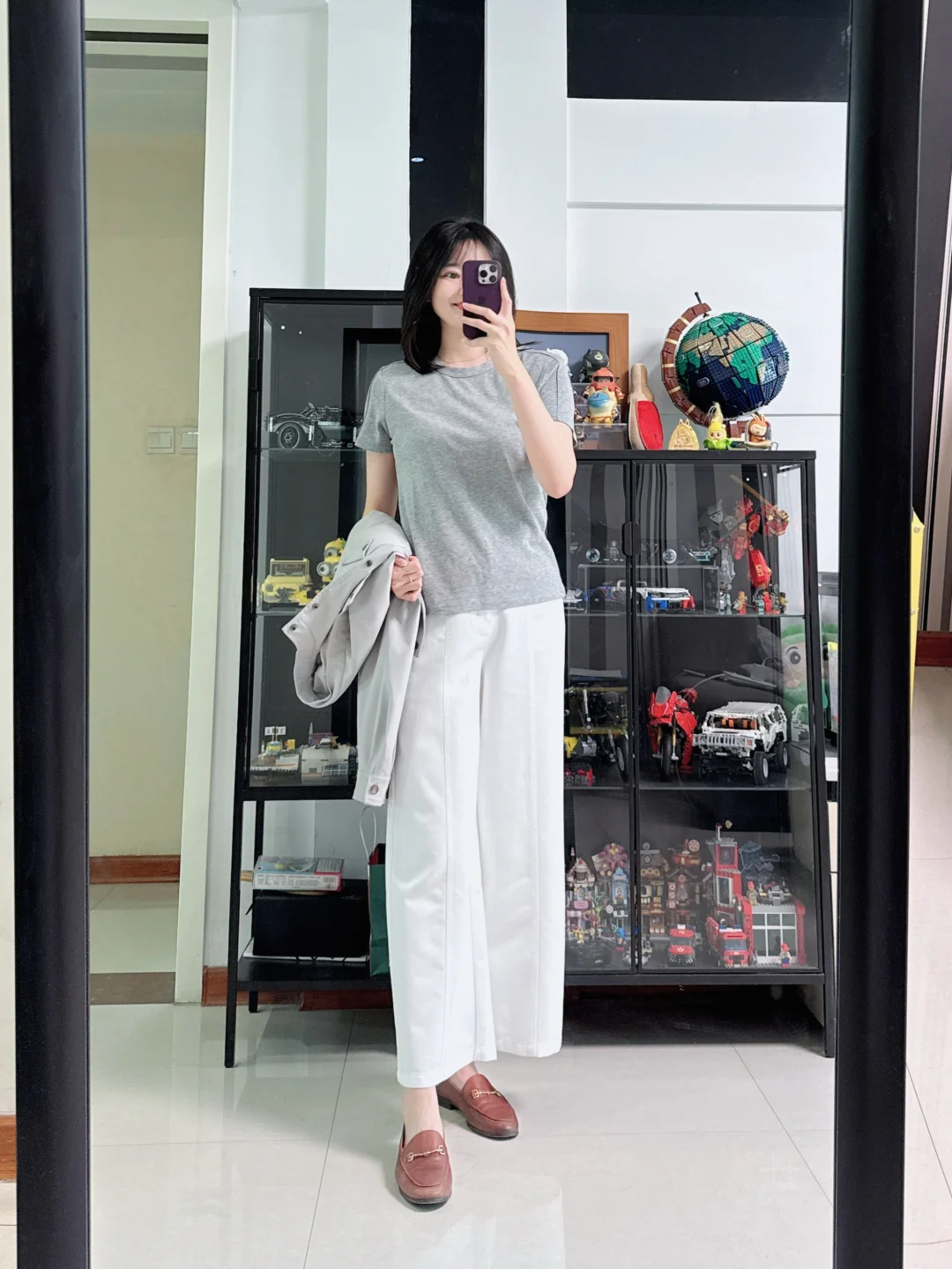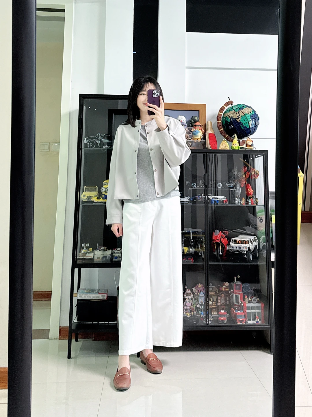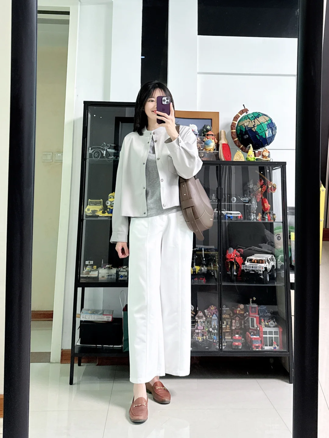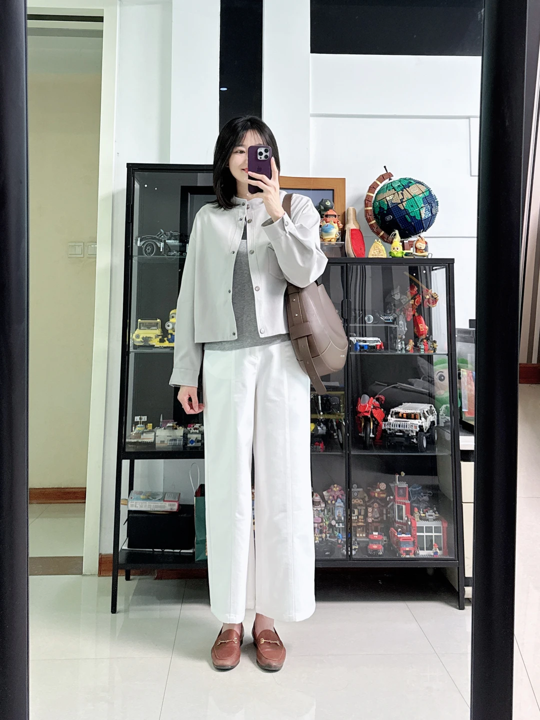 👩今日穿搭:简单灰色短款夹克,搭配白色直筒牛仔裤,我喜欢的通勤穿着是既得体又舒适。