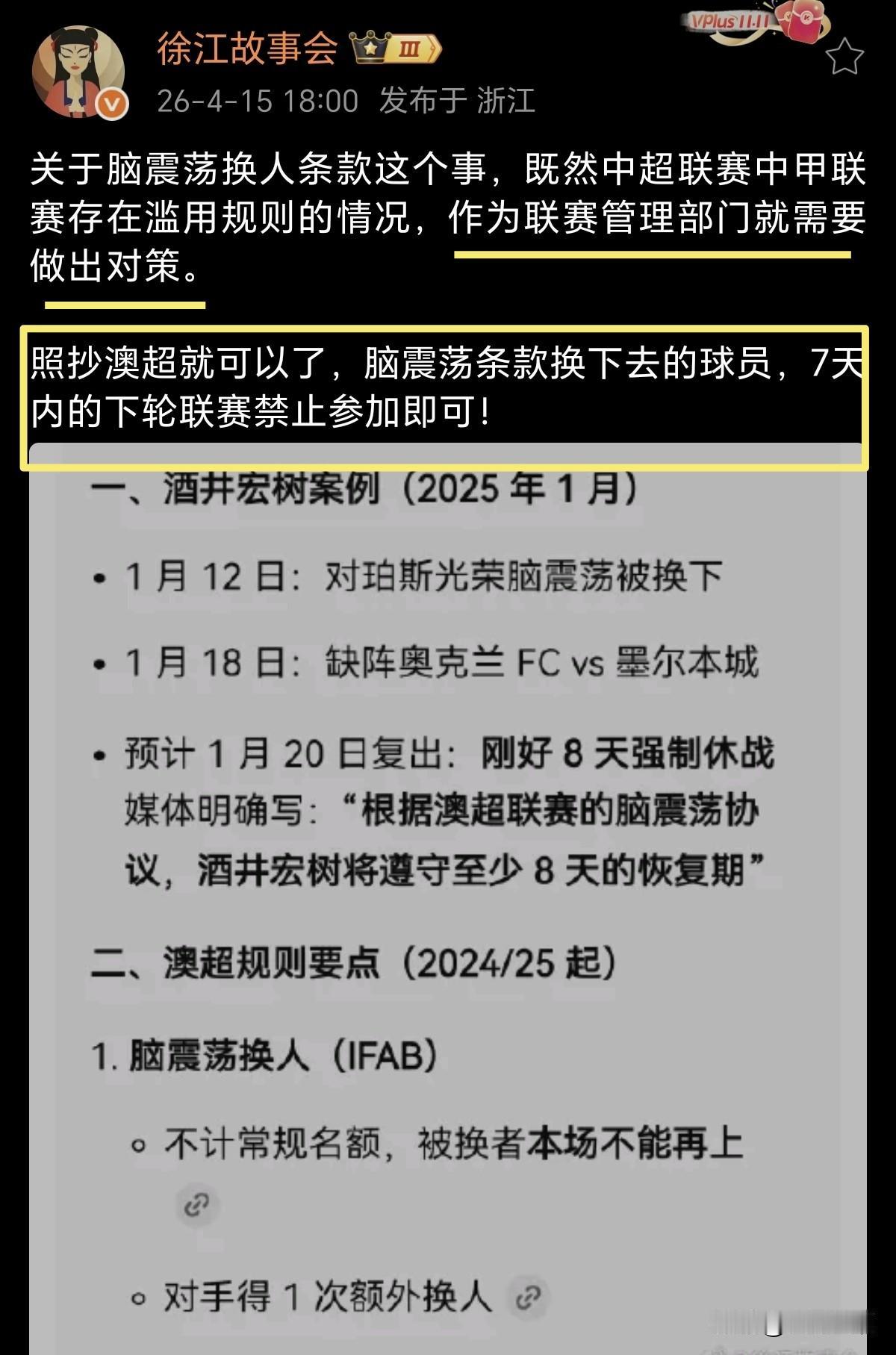 足球媒体人徐江表示,关于脑震荡换人条款这个事,既然中超中甲都存在滥用规则,作为联赛管理部门就需要做出对策,直接照抄澳超就可以了,脑震荡条款换下去的球员,7天内的下轮联赛禁止参加即可[加油]