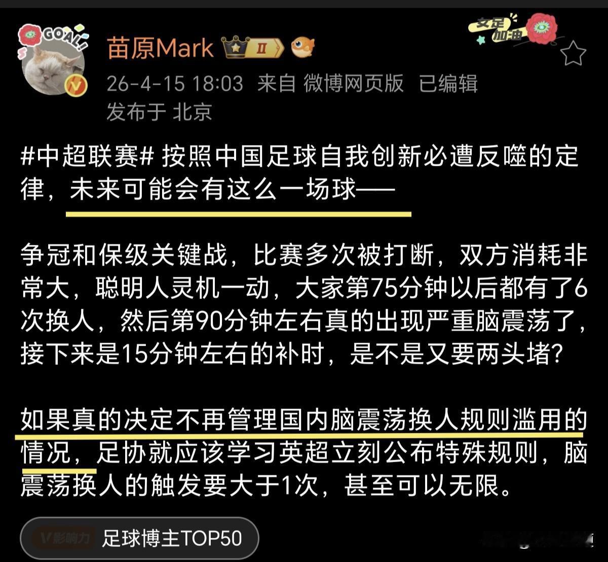 客观而言,这些足球媒体人的担忧是有道理的,因为他们深知,不论是中超联赛也好中甲联赛也罢,在钻这种规则空子绝对有一套,如果不把这个规则漏洞补上,让队医决定能否使用脑震荡条款,到时候就不是看球员是否头部受伤了,而是看球队需不需要球员头部“受伤”了[叹气]