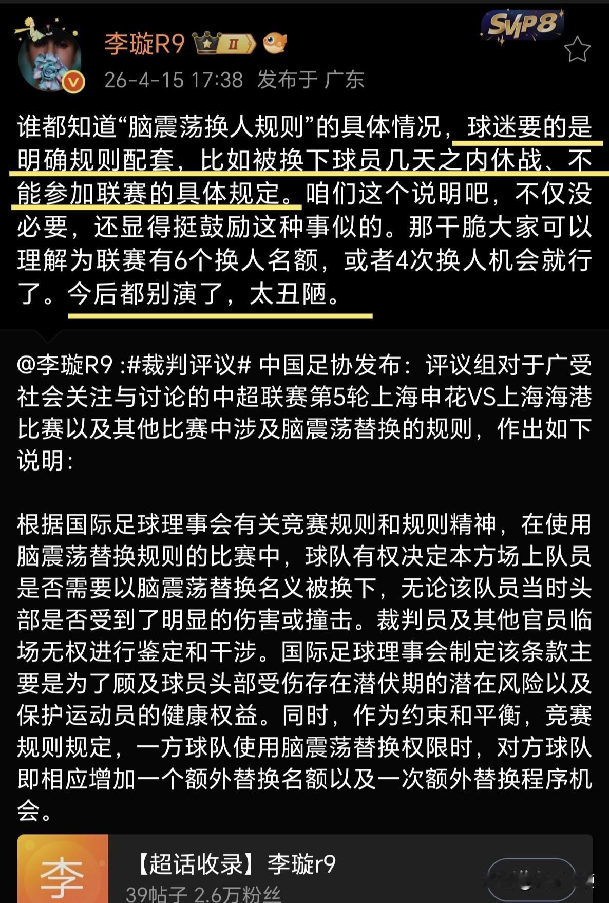 《足球报》主任李璇表示,球迷要的是“脑震荡换人规则”的明确规则配套,比如被换下球员几天之内休战、不能参加联赛的具体规定。但中国足协这个评议说明,感觉更像是鼓励这种事……