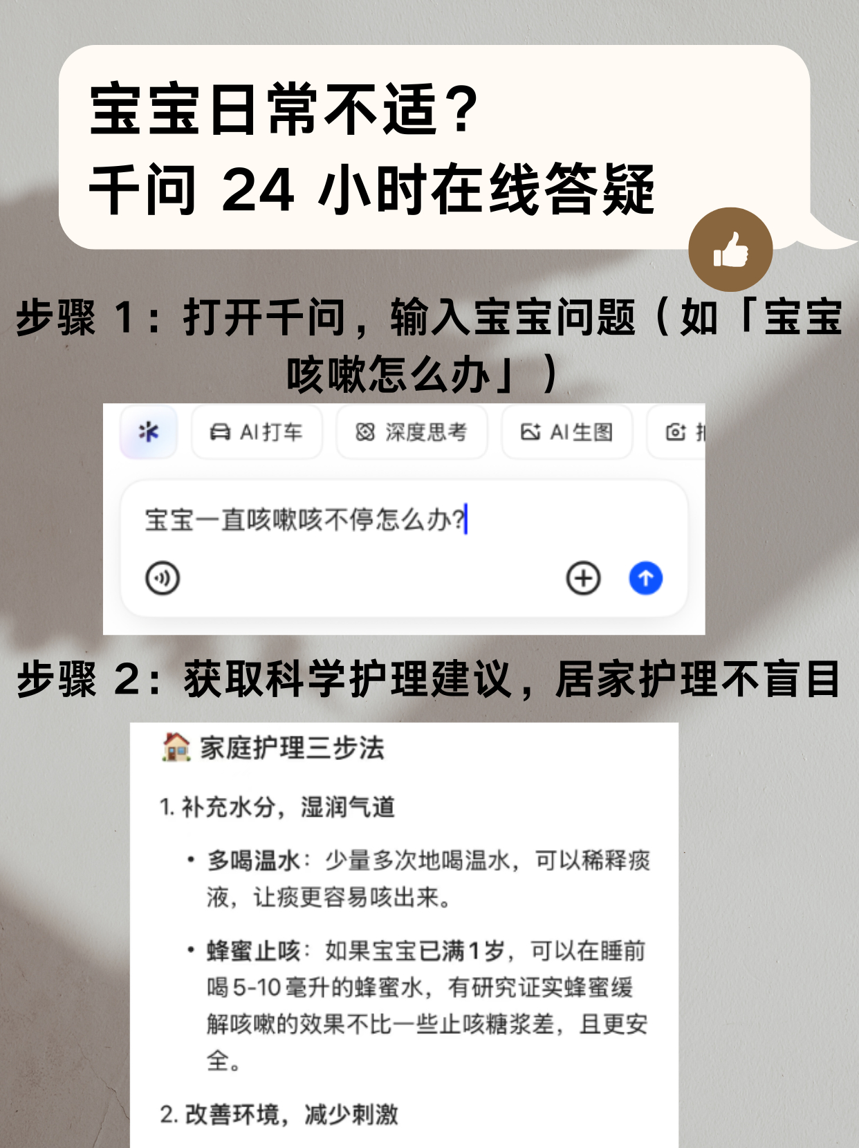 我们的爸妈vs我们当爸妈 千问把健康整得明明白白 以前爸妈带娃,病了就请假抱着跑医院;现在我们职场爸妈,上班间隙用千问AI救急!手机输入娃的症状,秒出病因分析、家庭护理指南,半夜娃不舒服也能随时查,比问同事、翻育儿书快10倍~全家老小的健康问题都能查,养生、用药、疾病预防全包含!千问千问健康