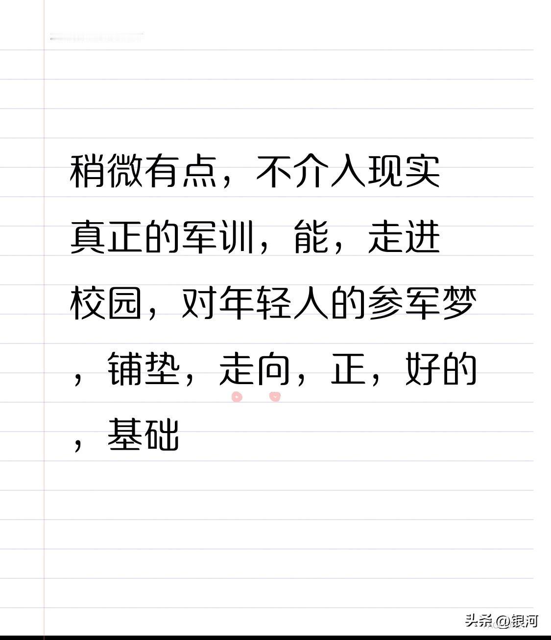 稍微不介入现实真正的军训,却能走进校园,这对年轻人的参军梦有着很好的铺垫作用。就