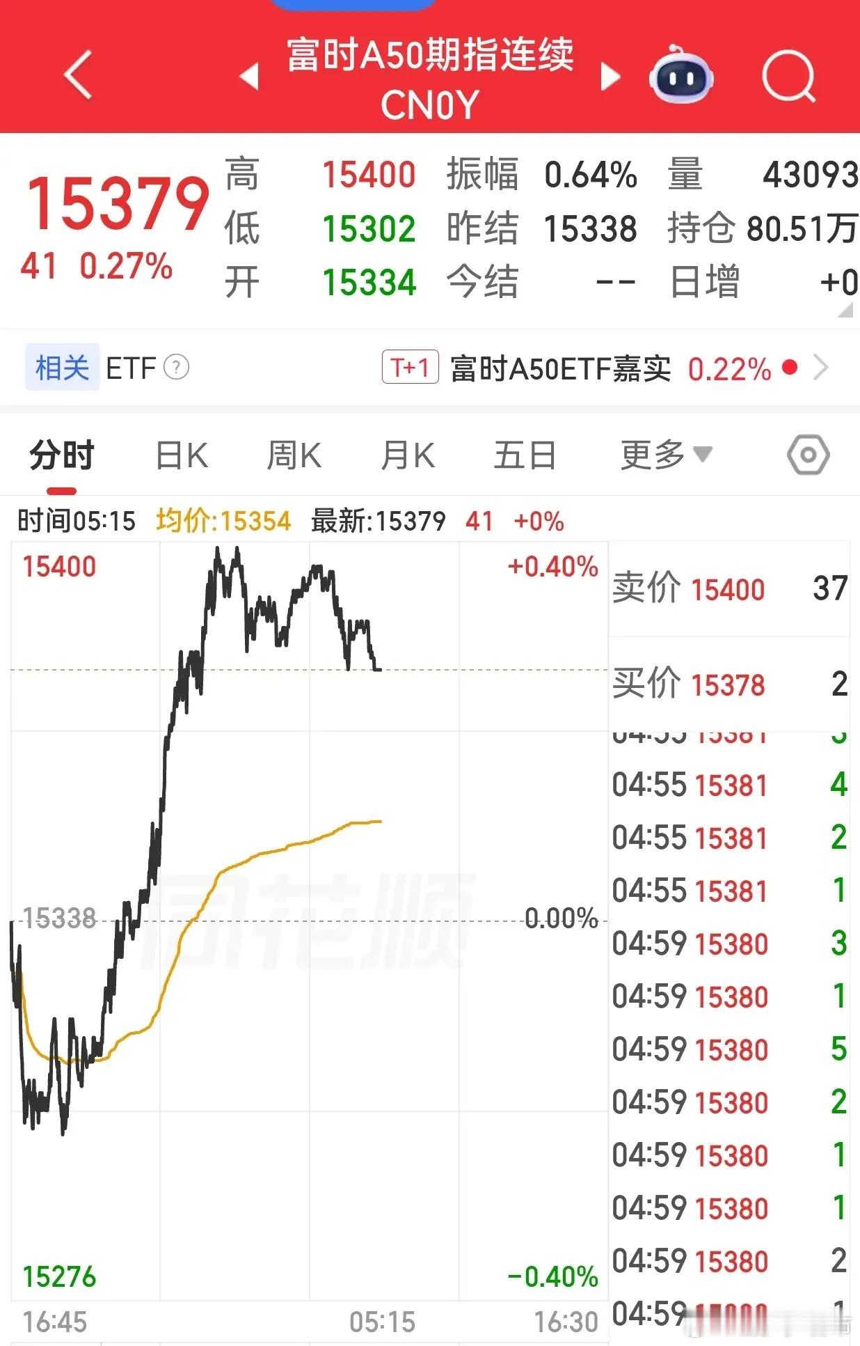 富时A50期指连续夜盘收涨0.27%,报15379点。