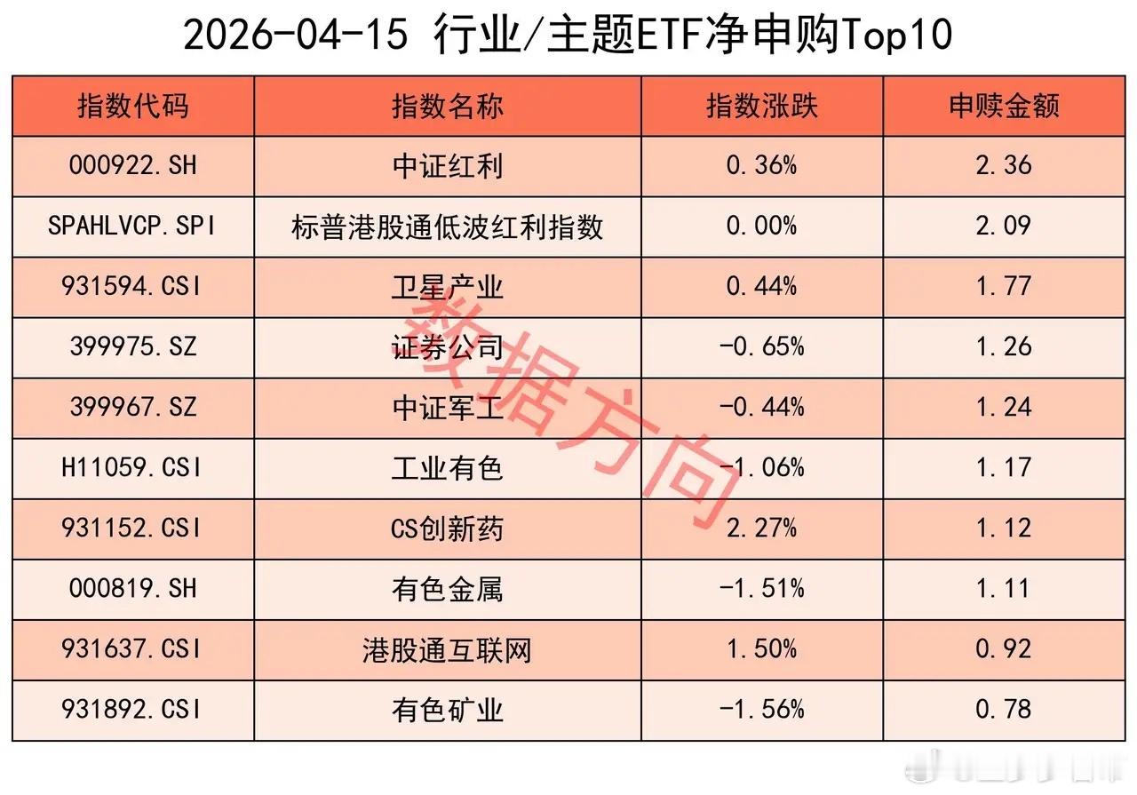 中证红利指数(2.36亿)、标普港股通低波红利指数(2.09亿),一起进入申购榜。红利低波指数(-2.48亿),进入赎回榜。