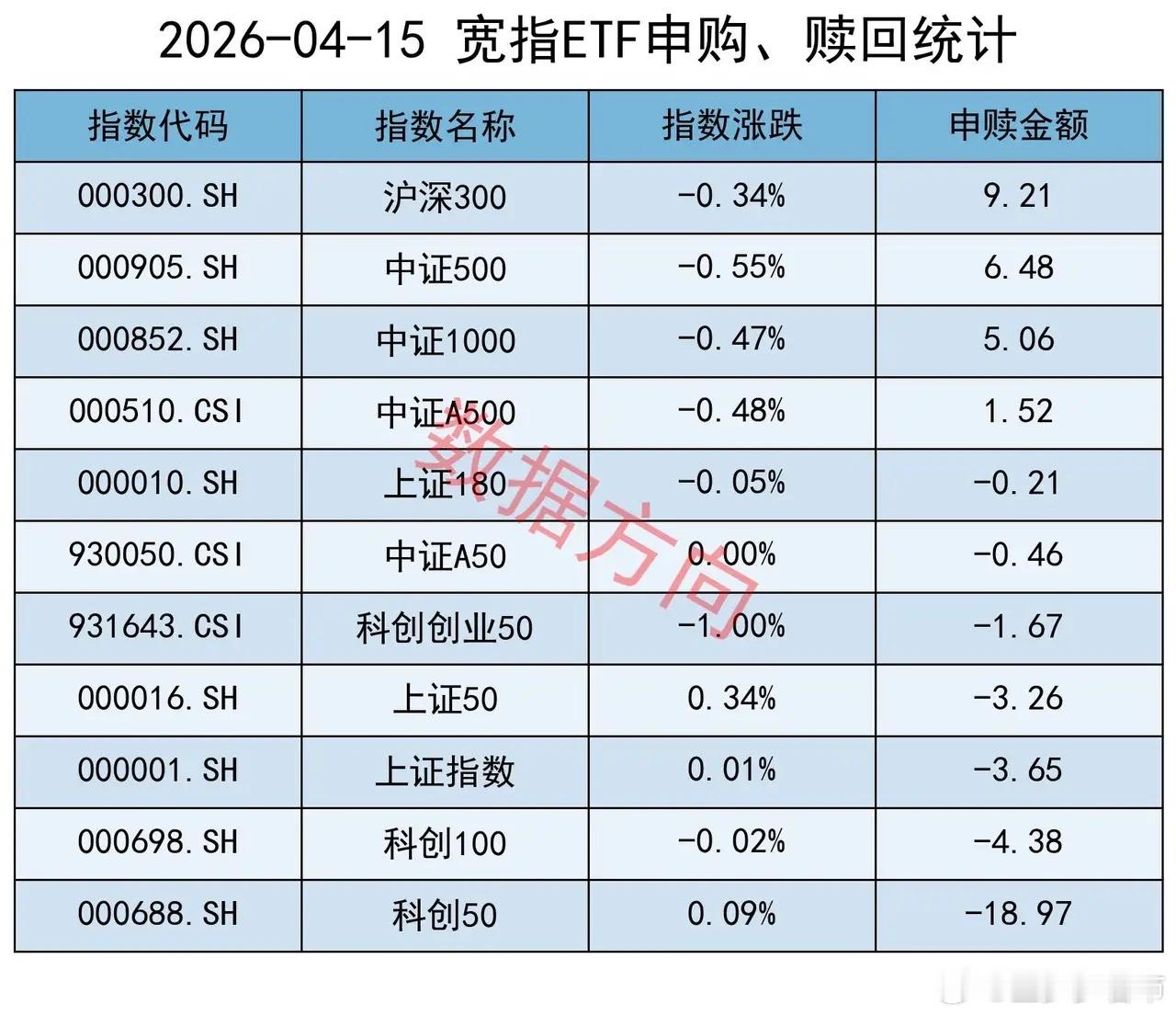科创100指数(-4.38亿)、上证指数(-3.65亿)、上证50指数(-3.26亿)、科创创业50指数(-1.67亿)、中证A50指数(-0.46亿)、上证180指数(-0.21亿),净赎回都在5亿以内。