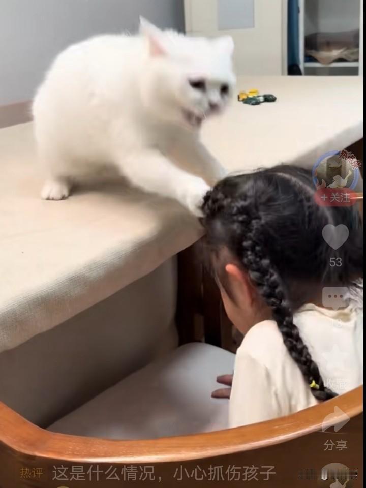 小女孩来劲了,又拍了猫几下,这个猫这回不客气了,用两个爪子一下抓着小女孩的头发,小女孩瞬间掉在椅子下面了!