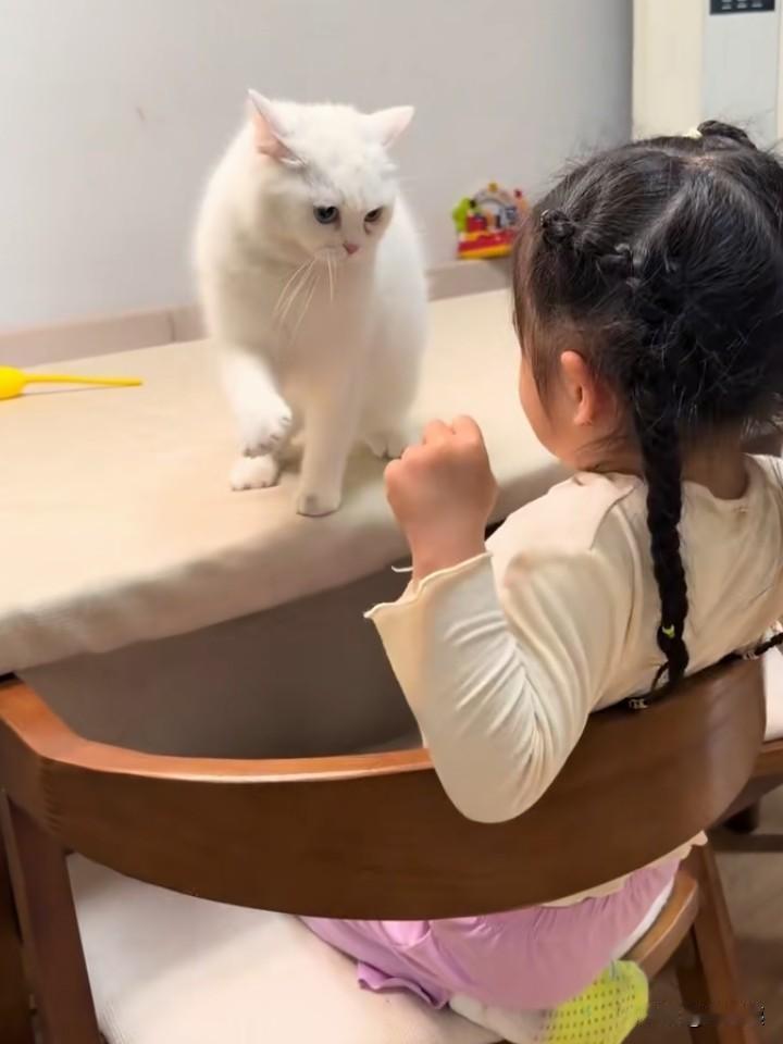 只见一个两三岁左右的小女孩,坐在凳子上,猫站在桌子上,这个小女孩轻轻的拍打了一下猫,这个小女猫就轻轻的回拍了一下小女孩!