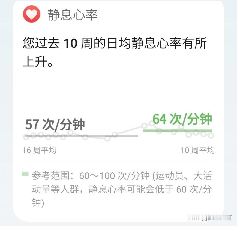 我去年跑步时静息心率平均是56次/分钟,停跑三个月时静息心率提高到64次/分钟,复跑一个半月后又下降到了57次/分钟。