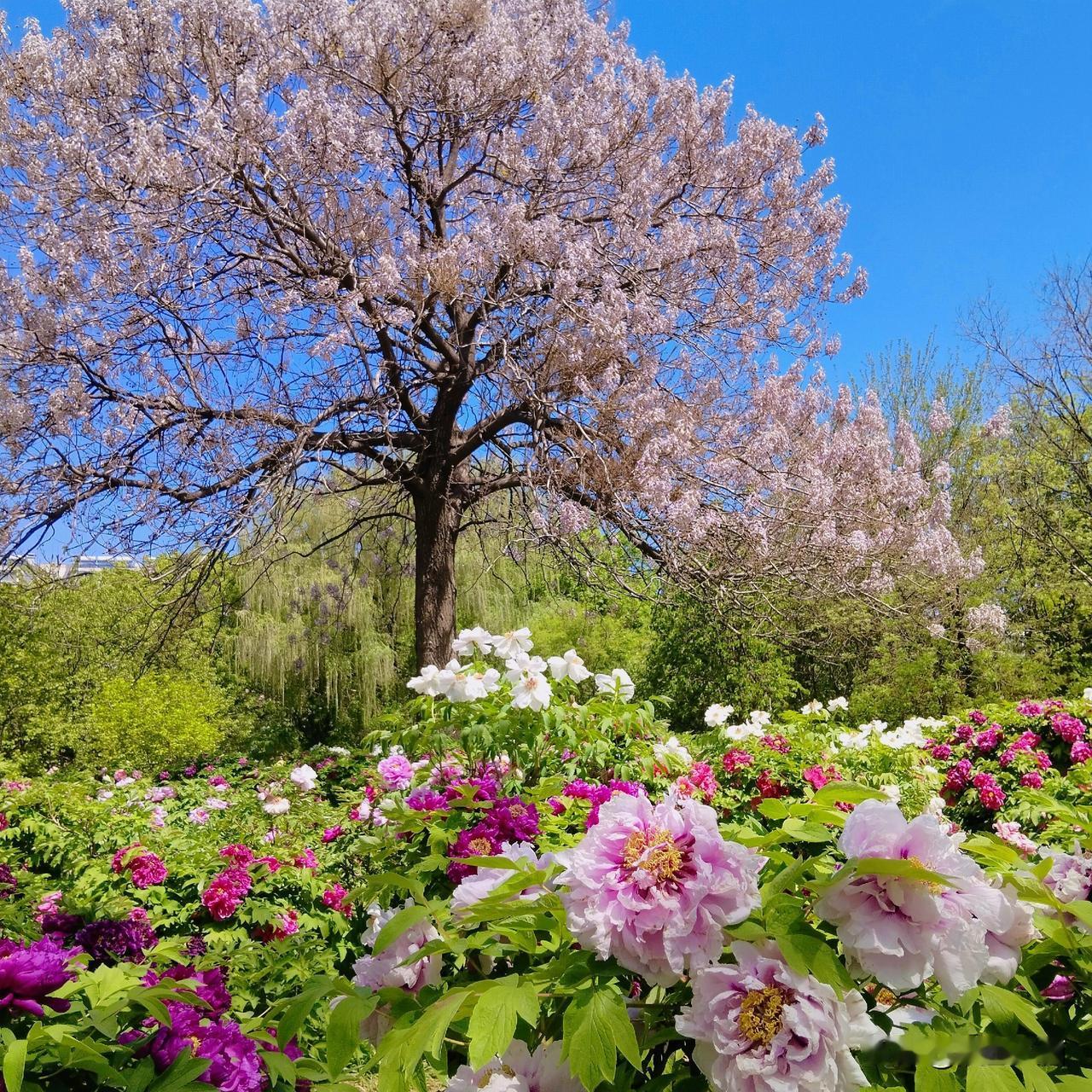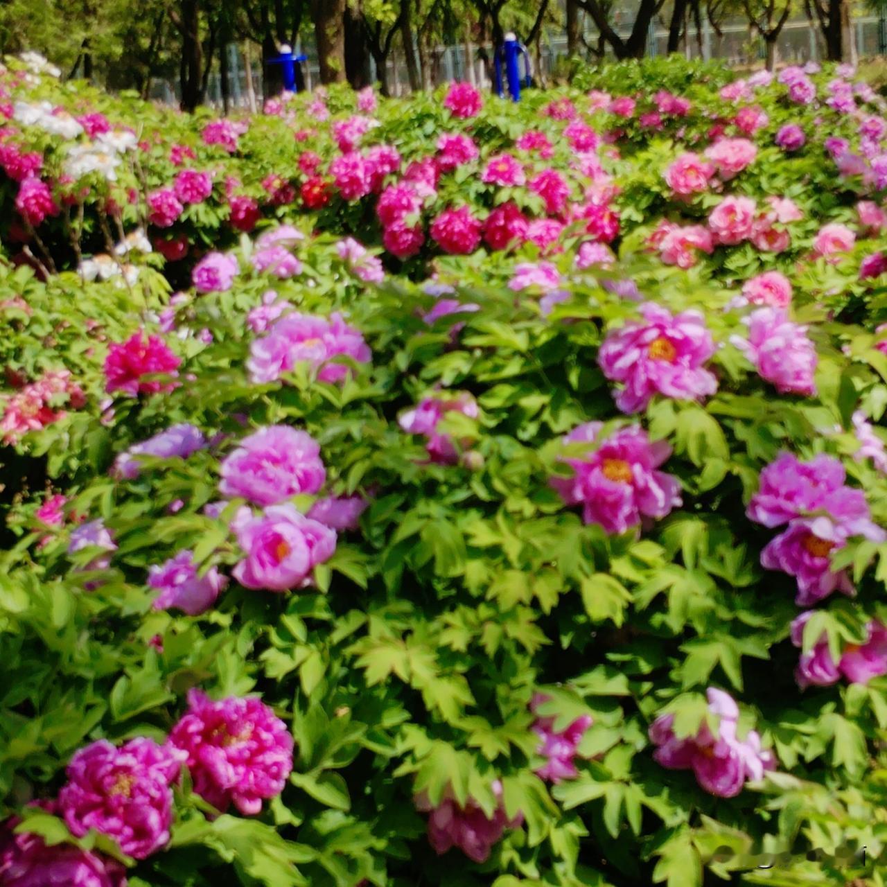 牡丹全开了,花色各异,姿态万千,香气袭人,蜜蜂忙着在花中钻来钻去。