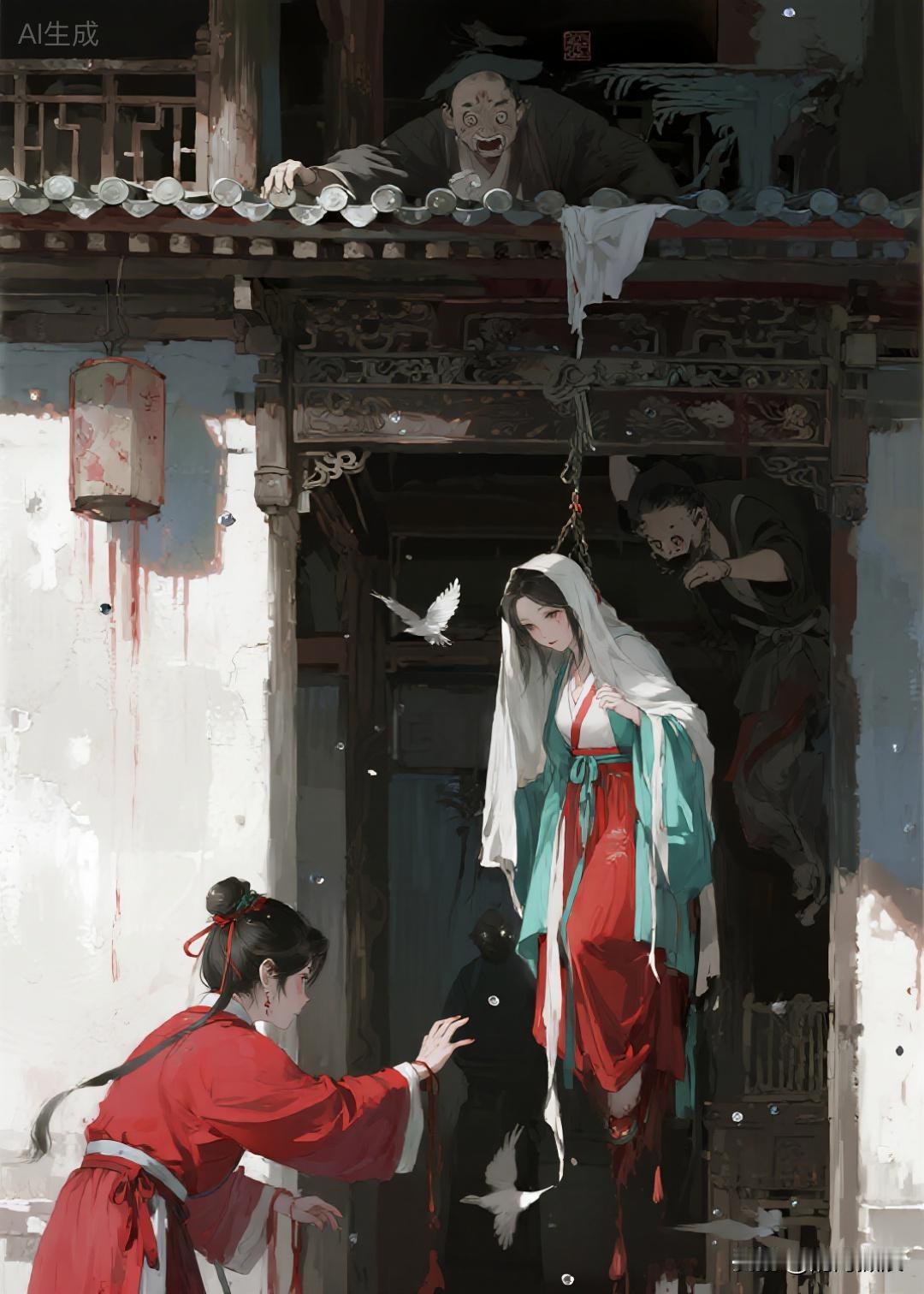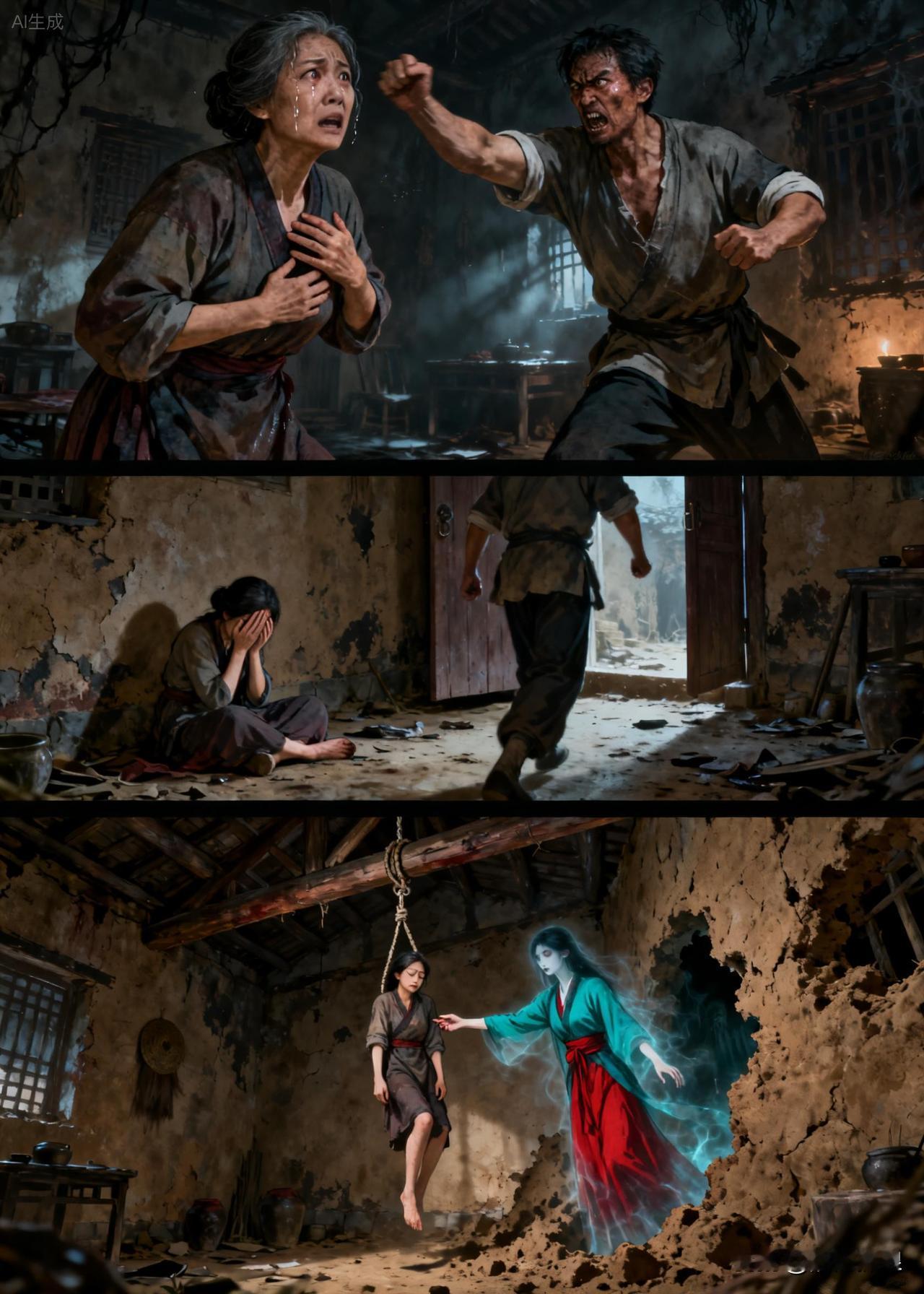正在这紧要关头,家中的墙壁突然裂开,从中走出一个青衣红裙的女子,把上吊的妇人托起并解下绳索。