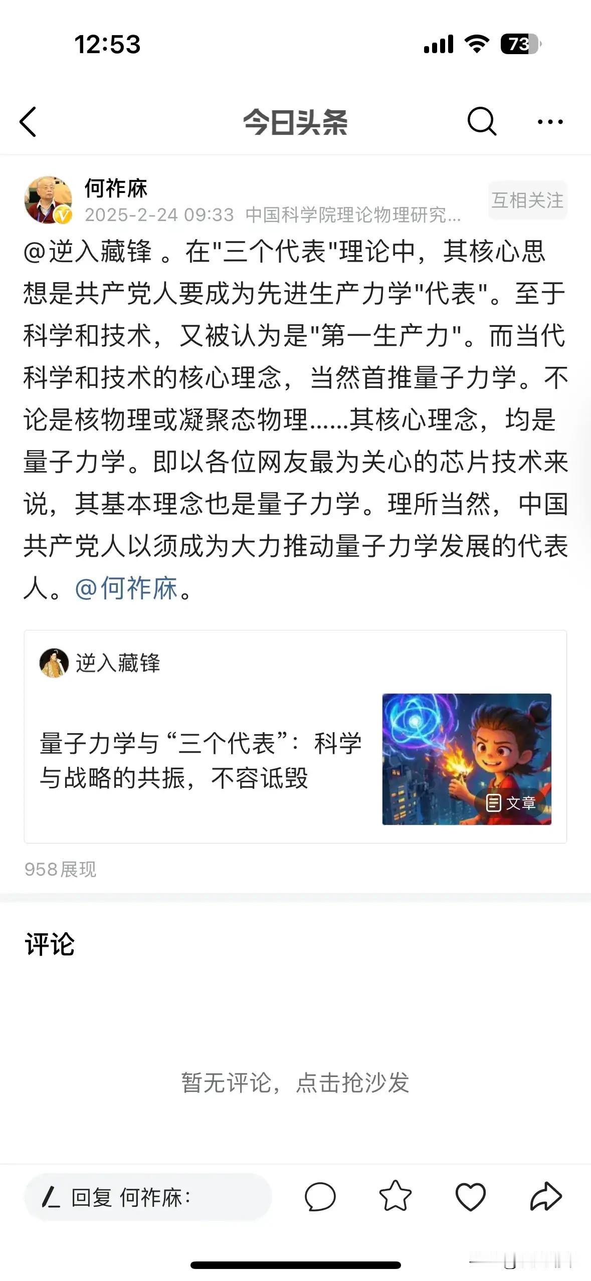 我认为,首先您是一个合格的政治家,《论三个代表与量子力学的关系》一书,让人振聋发聩;
