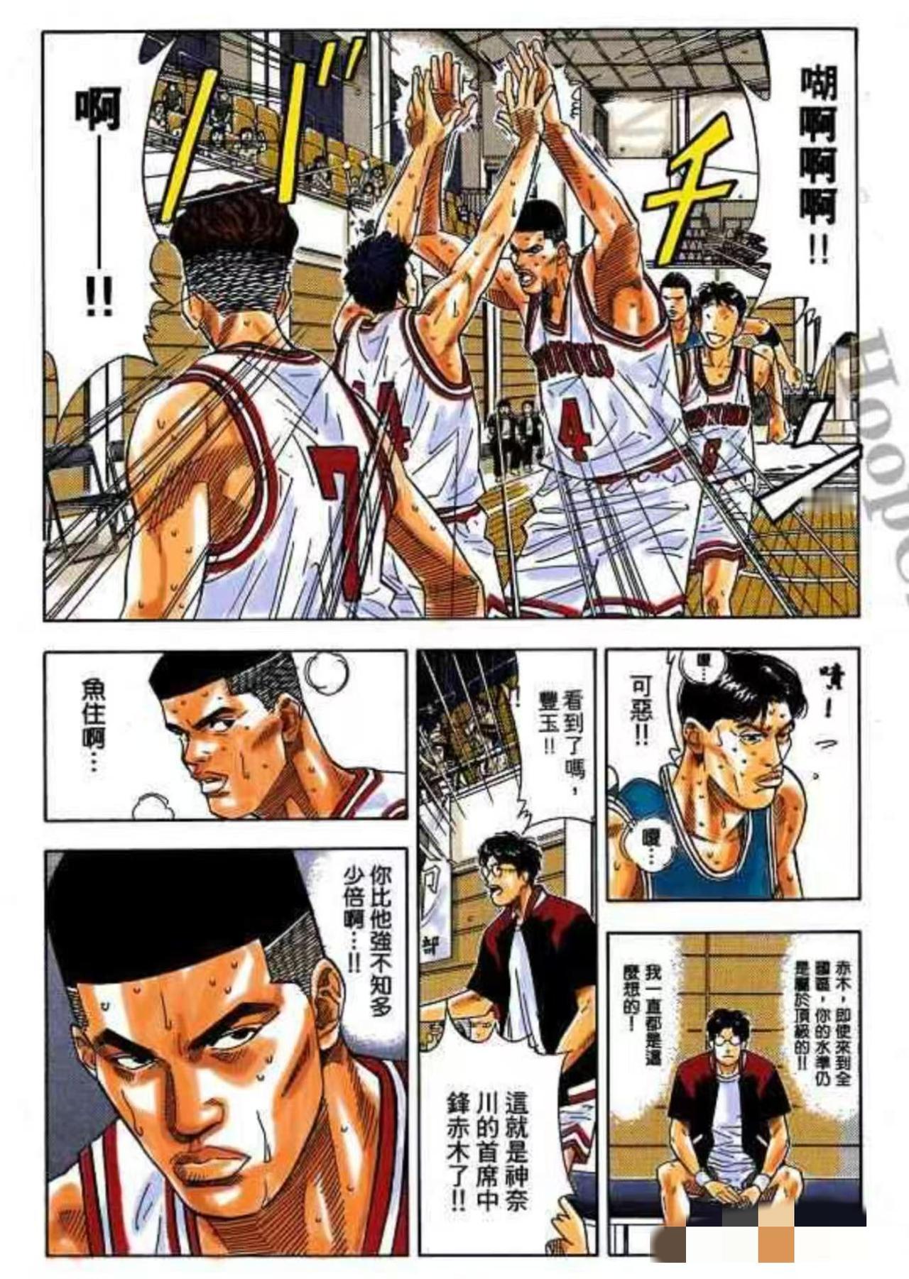 有个很好的对比。丰玉队的中锋岩田三秋,身高1米90,跟高砂差不多。结果对位赤木时,被爆得渣都不剩。赤木一边打,还一边念叨“鱼住啊,你比他强太多了”。在赤木眼里,神奈川压根没有“四大中锋”,只有“两大中锋”,就是他赤木刚宪和鱼住纯。高砂和花形,可能都不在他认为的“顶级对手”名单里。