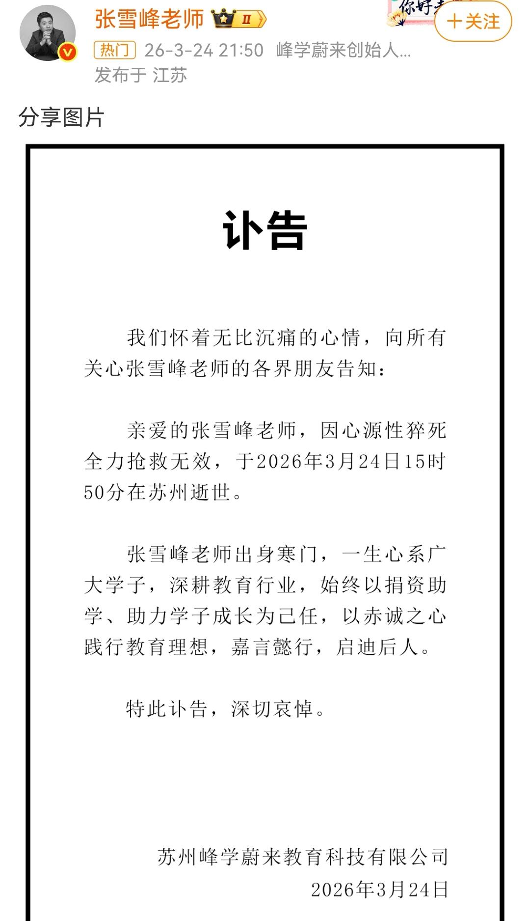 张雪峰走了,41岁,心源性猝死。