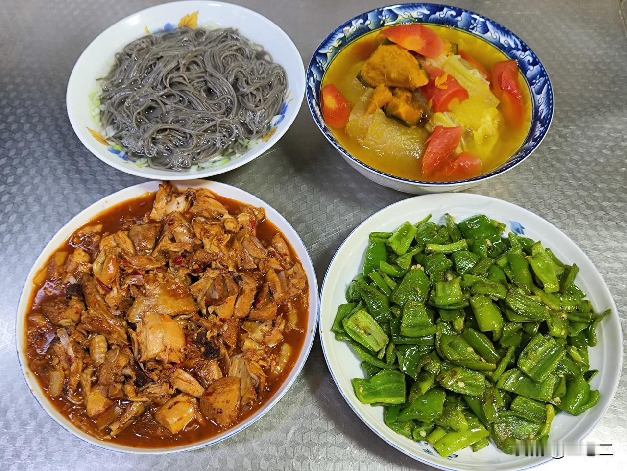 四月十五日午餐,我做了两菜一汤一主食。第一道是姜汁热窝鸡;第二道是素炒青椒;汤是蔬菜汤(打卡第九天);主食是煮黑荞麦面。