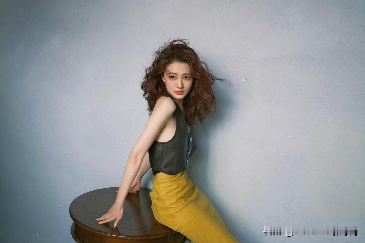 下搭芥末黄麂皮包臀中裙,柔糯质感中和了皮质的硬朗,撞色高级又吸睛,勾勒出曼妙腰臀比。慵懒蓬松的棕发红唇,搭配复古蓝调背景,松弛又贵气,清冷御姐感拉满。