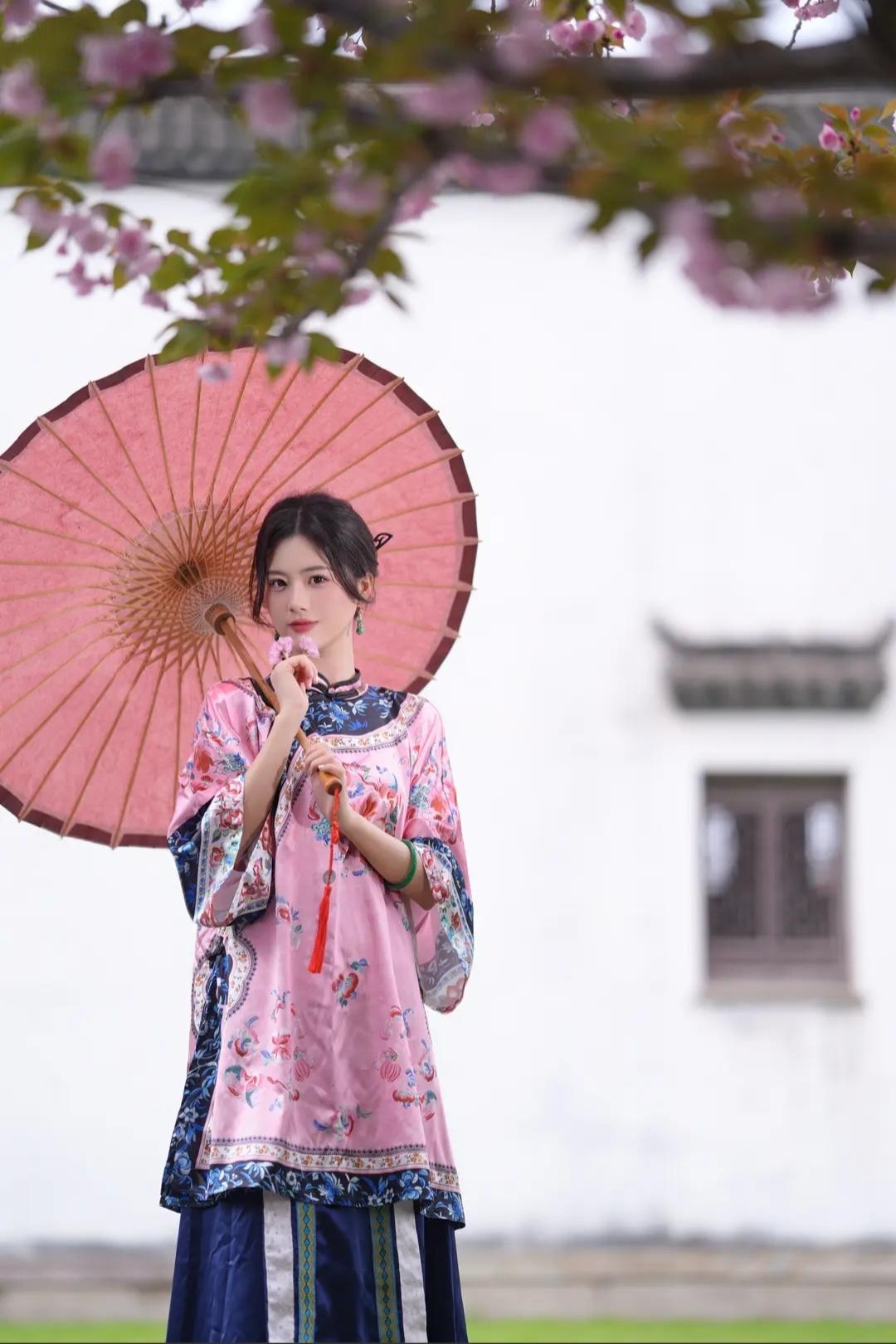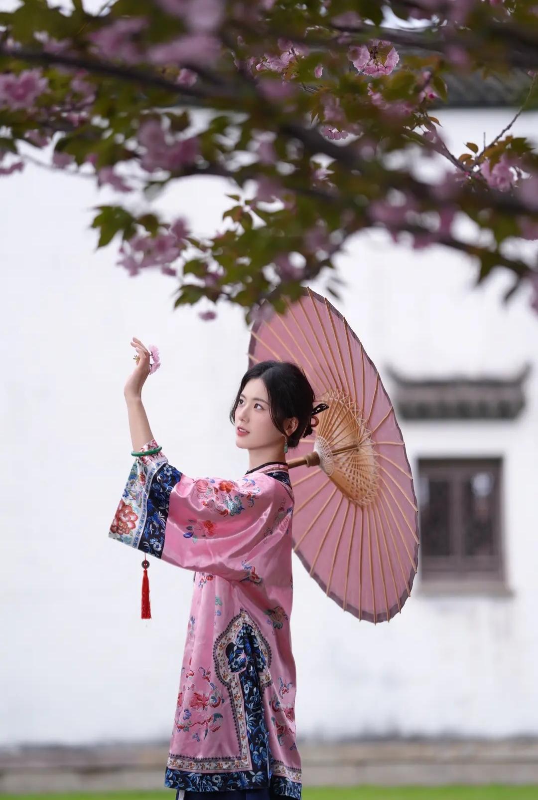 粉嫩春日,撑伞漫步,花影婆娑,古风唯美。