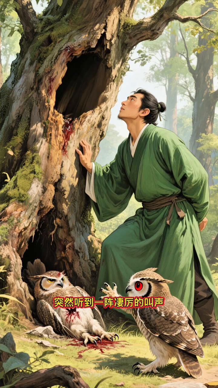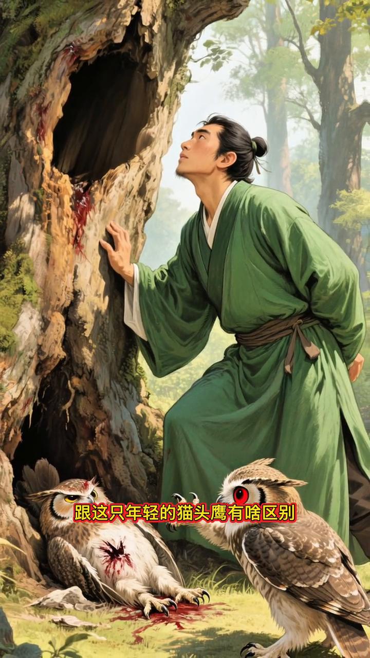 弟弟这边去村外树林里砍柴走,突然听到一阵凄厉的叫声,只见树洞里有一只老猫头鹰岁数大了,飞不动了,旁边站着一只年轻的猫头鹰,正凶狠的用爪子抓老猫头鹰,还用嘴使劲啄老猫头鹰的翅膀,老猫头鹰疼的直叫。弟弟从来没见过这么残忍的场景,突然想到了自己对娘的态度,跟这只年轻的猫头鹰有啥区别?要是以后自己老了,儿子也这么对自己,那得多惨。
