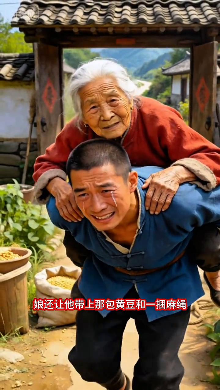 三天后母亲换了身干净衣裳背娘进山,你要是不送娘现在就死在你面前。大力哭成了泪人只能背起娘,娘还让他带上那包黄豆和一捆麻绳。一路上娘悄悄把黄豆一粒一粒撒在地上,走到山脚下又把麻绳一头系在粗大树上,另一头垂到坡下。到了狼洞门口大力把娘安置好,哭着转身就跑了。