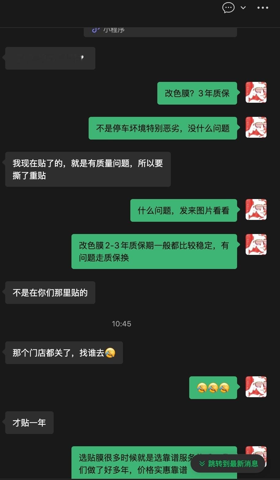 刚小番薯上来个问贴膜的。跟我吐槽,他去年贴的,才 1 年就开裂分层了,但那家店已经关了,人都找不到。。。