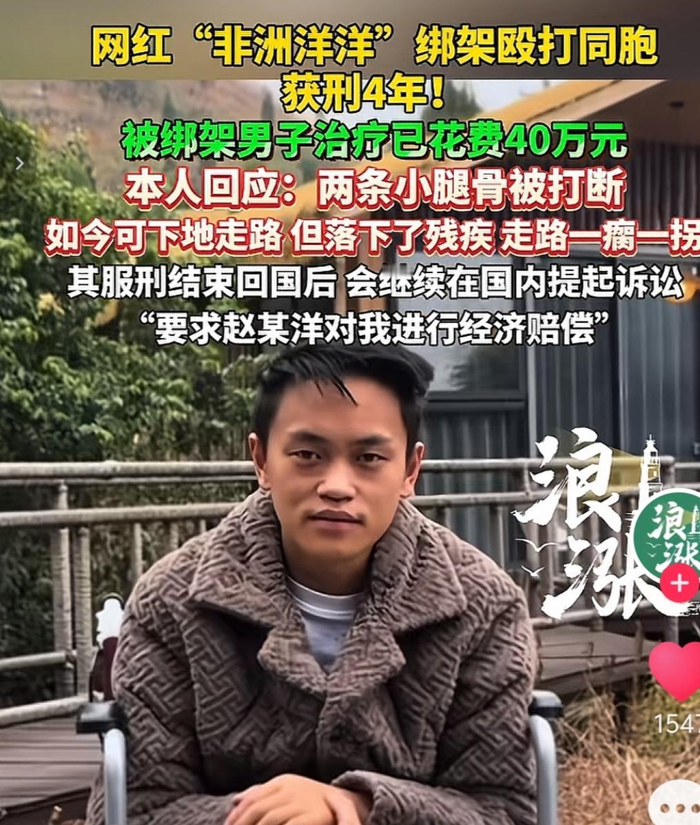 网红“非洲洋洋”赵某洋被判了,判了四年有期徒刑。而那个被他殴打骨折的男子曾书记表示,服刑完回国,会提起诉讼,要求他赔偿经济损失,他的治疗已经花费了40万元。治疗完的曾书记虽然可以站起来了,但是走起路来一瘸一拐的,这一辈子算是留下这个后遗症了。话说这个赵某洋还真的是够狠的,不听他的话,就往死里整别人。他不就是自认为他在外国,没有人能管他吗?可他不知道的是外国也是有法律的,只要他的事情被曝光,等待他的就是法律的严惩。可不要抱着侥幸心理做事,下场会很惨的。就会在外国欺负同胞,这算什么本事,真的一点底线都没有。