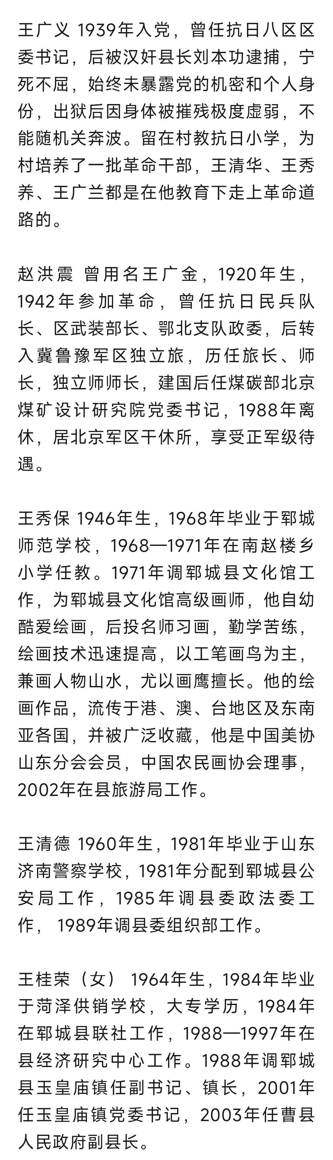 【中共地方组织建设】1938年,王广宇秘密加入中国共产党,王广义、王广金在他的鼓励下,陆续参加了党的组织。1946年党的组织公开,先后有王良山、王清海、王秀山、赵进登、赵进功入党。1948年底,淮海战役开始,全村出动牛车10辆,人推车20辆,到底马牧送米,支援淮每战役。共送军粮1万公斤、鞋400双。1946—1949年,三年期间共送担架20付,