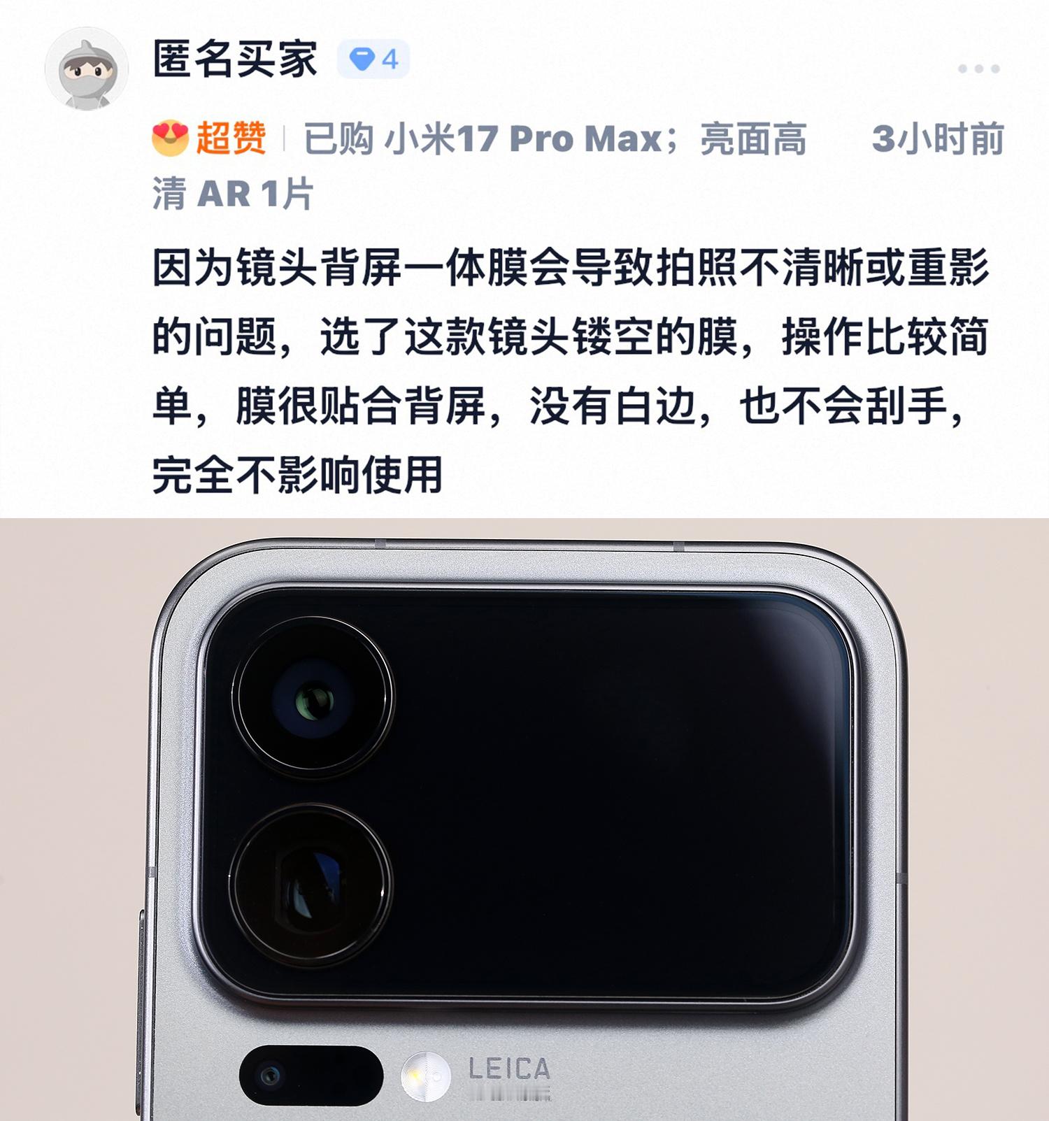 小米 17Pro 系列这背屏膜,不带神器,也可以轻松贴准精准契合摄像头开孔,这沉浸感舒服了。AR 抗反射效果在线,息屏状态下黑得深邃
