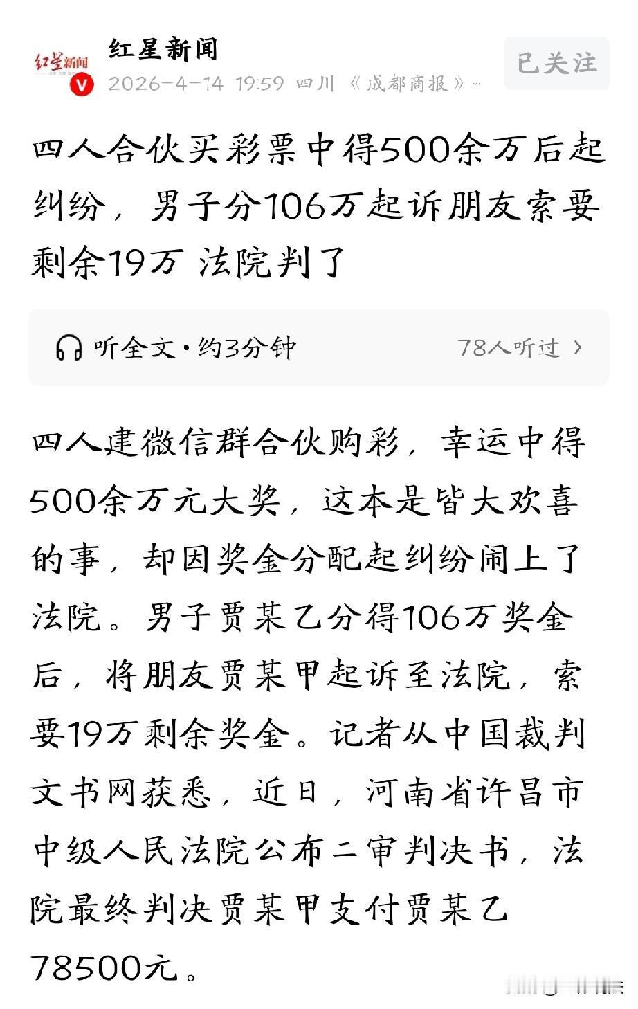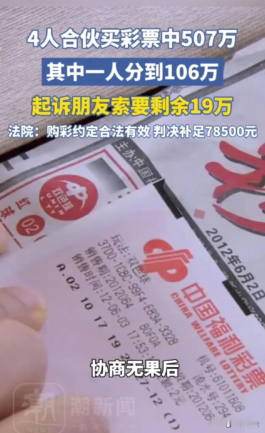 这场风波最终以二审落锤而告终,贾某乙虽然多拿了七万多块钱,却永远失去了曾经的兄弟,而那几个曾经一起做着发财梦的哥们儿,也再没有凑在一起买过一张彩票,这五百多万终究是买不回那份早已破碎的默契和信任了。